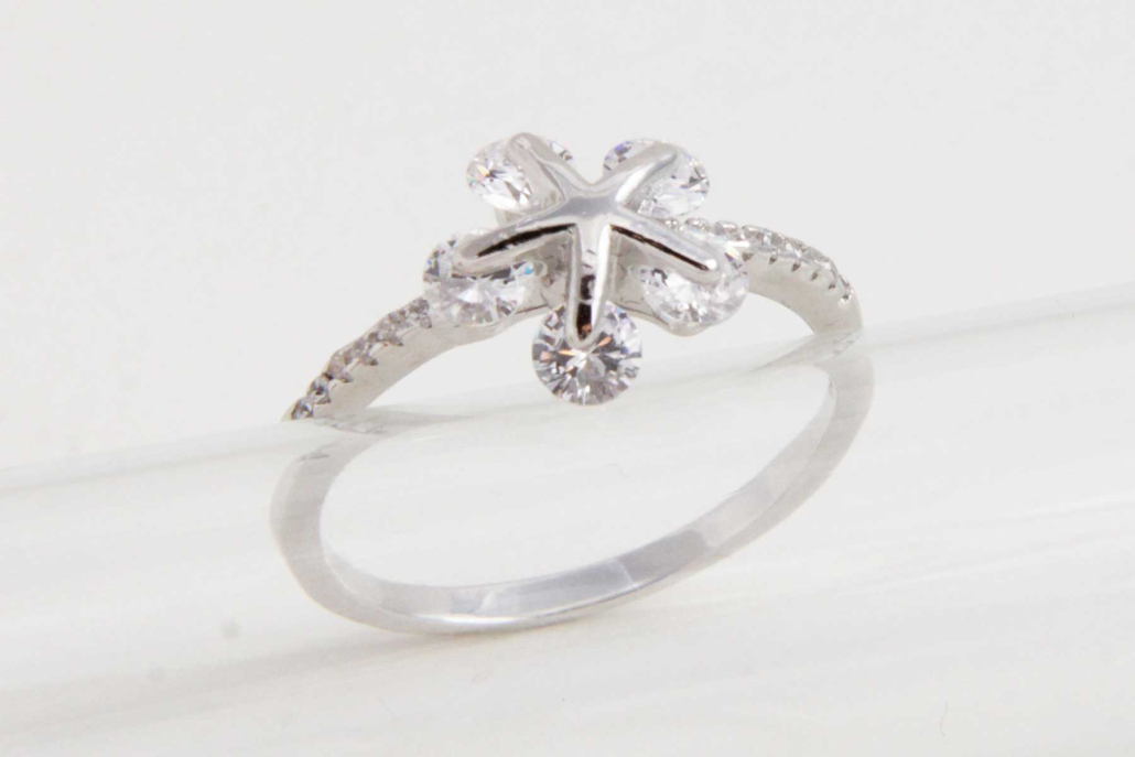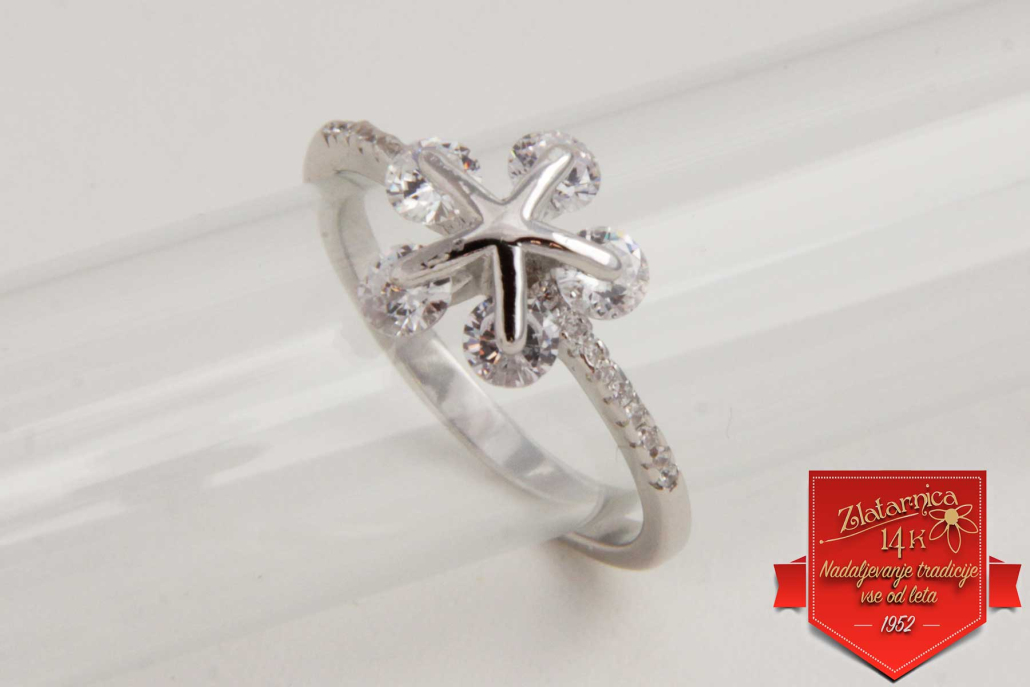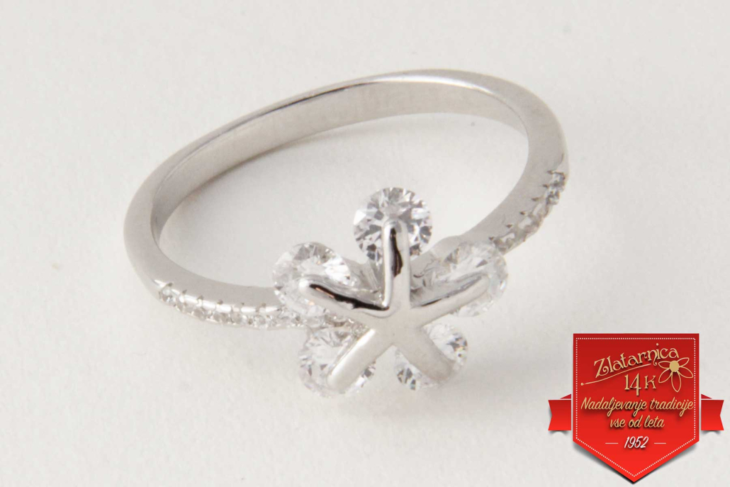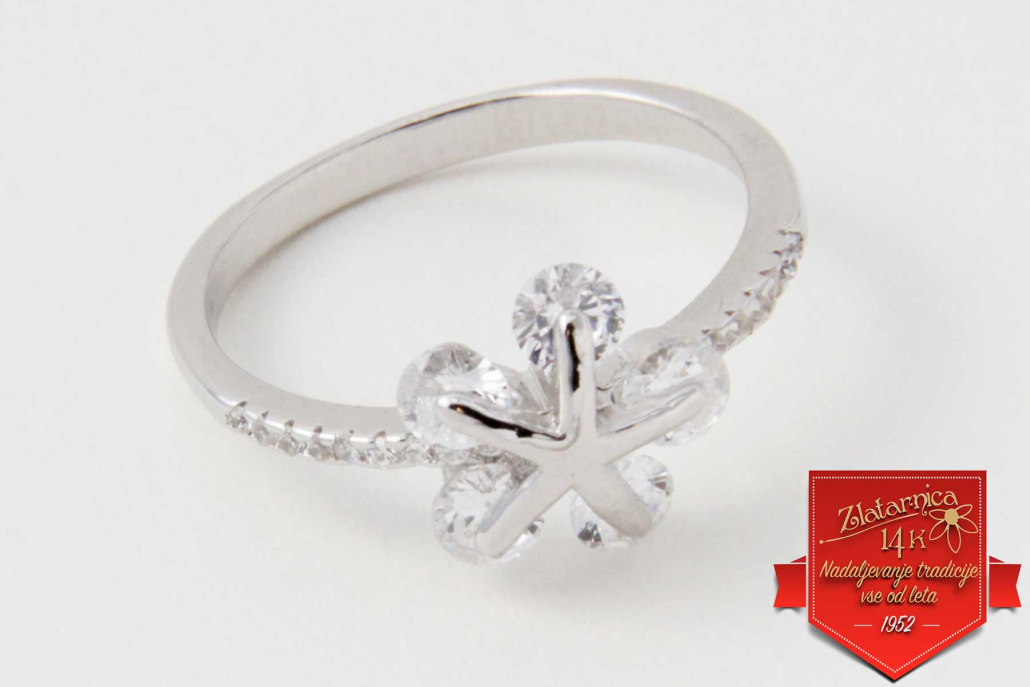 Elegantni srebrni prstan z privzdignjenim srednjim delom v obliki zvezde, s karki zakjlučenimi z petimi okroglimi cirkoni.