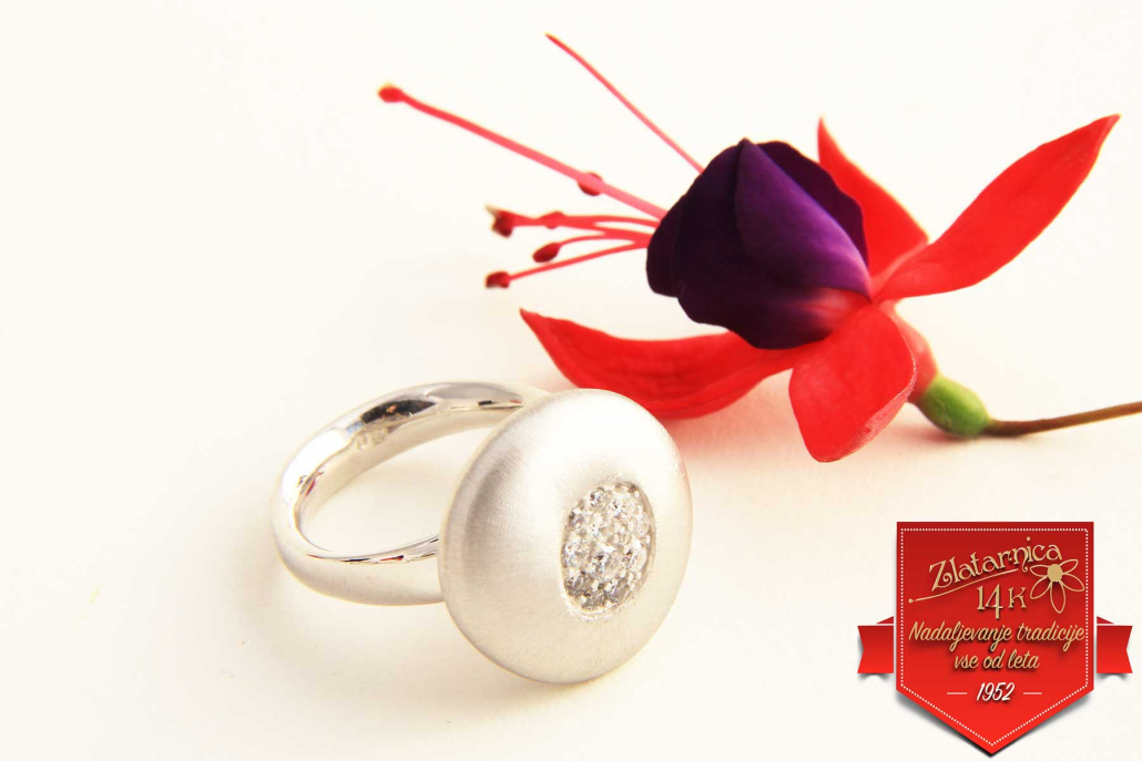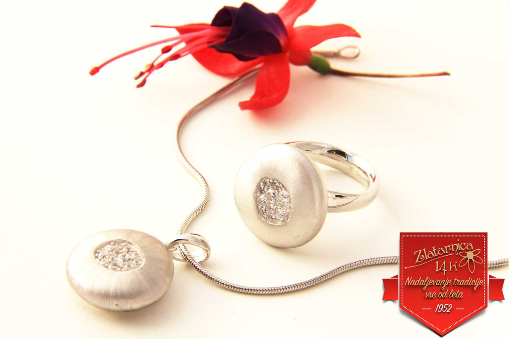 Srebrni prstan v obliki prodnika, matirane površine s cirkoni v osrednjem delu. Na voljo tudi enak obesek.