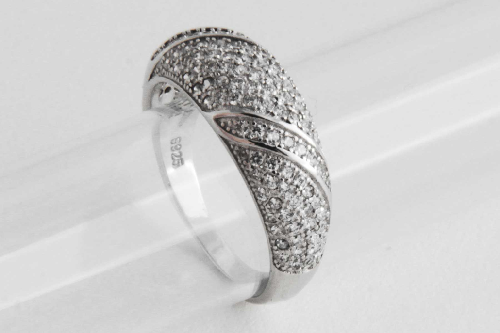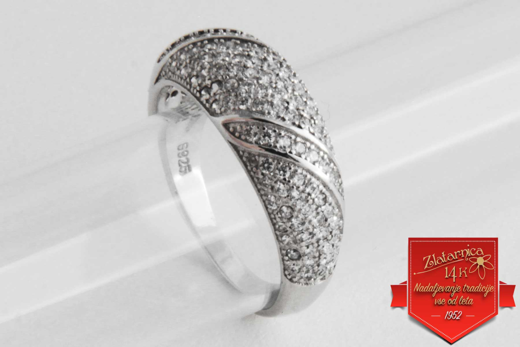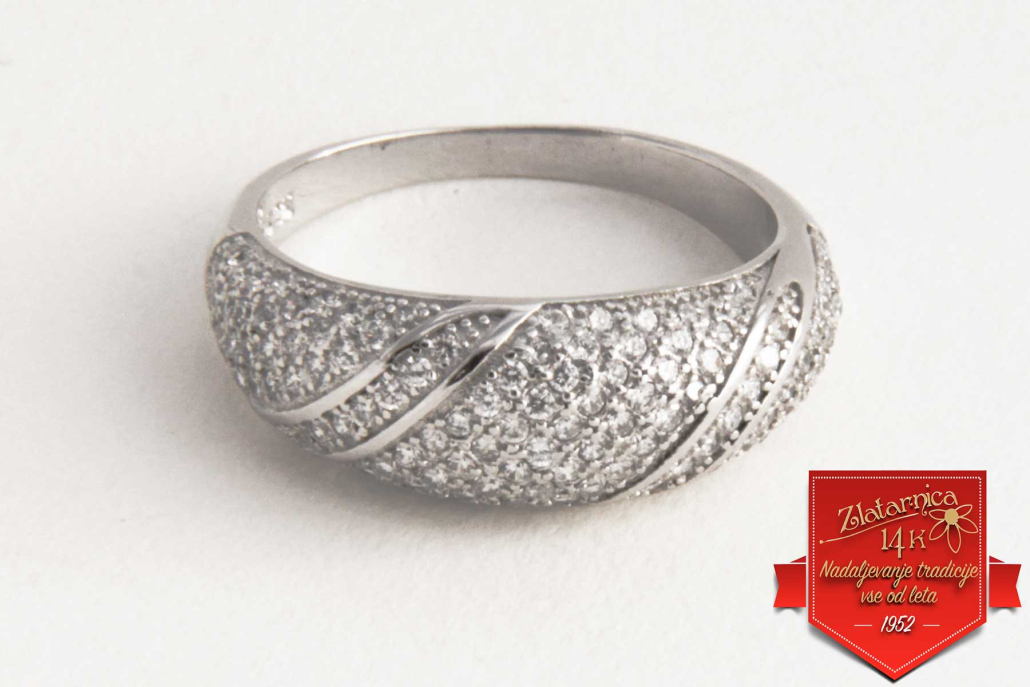 Srebrni prstan s cirkoni, ki so razporejeni diagonalno po dolžini prstana.