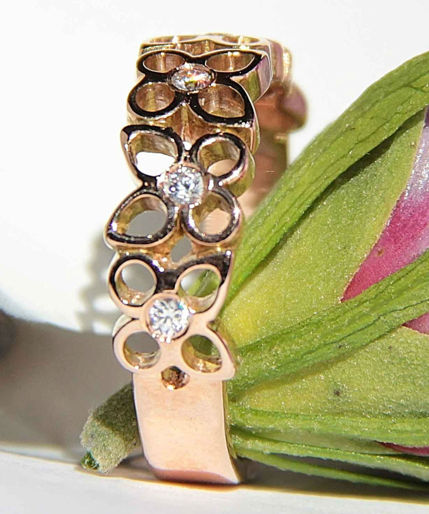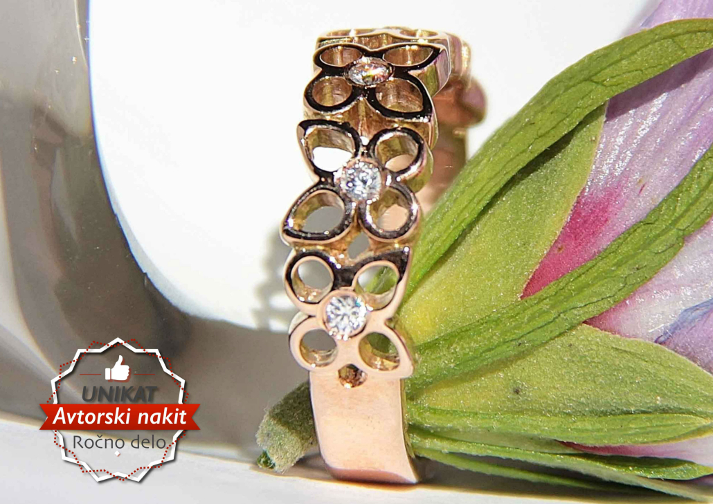 Unikaten, ročno izdelan prstan, sestavljen iz metuljčkov, s cirkoni in iz rdečega zlata.