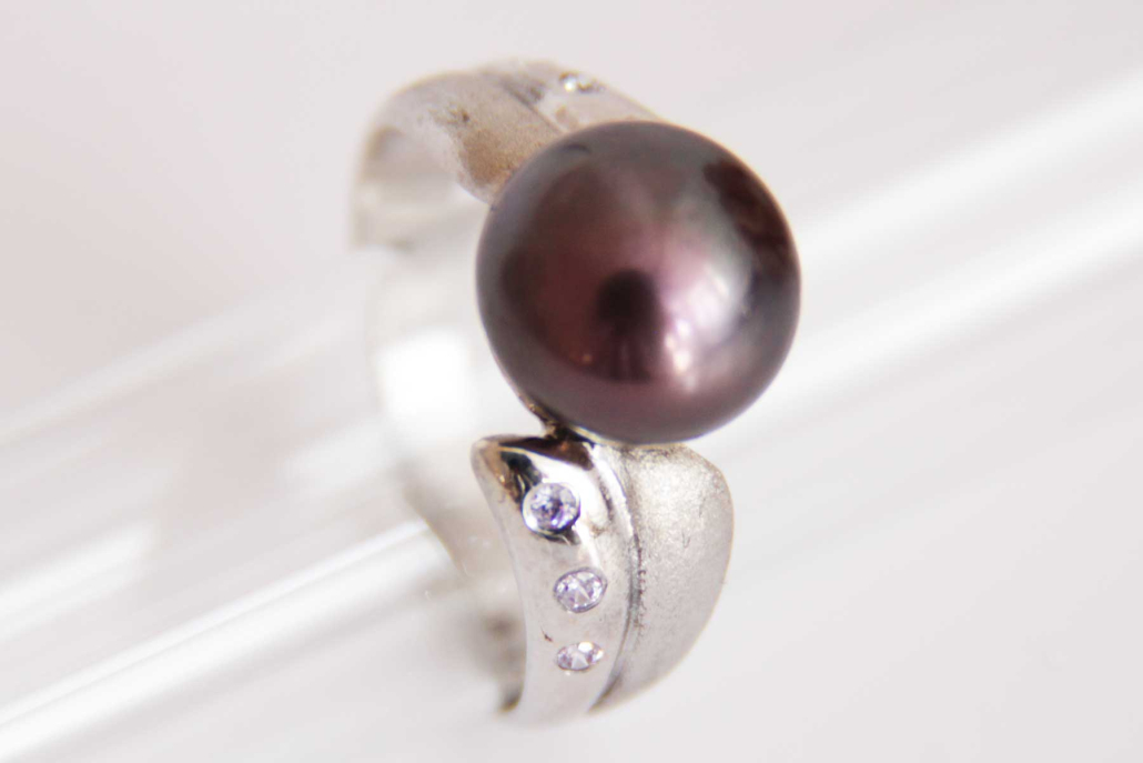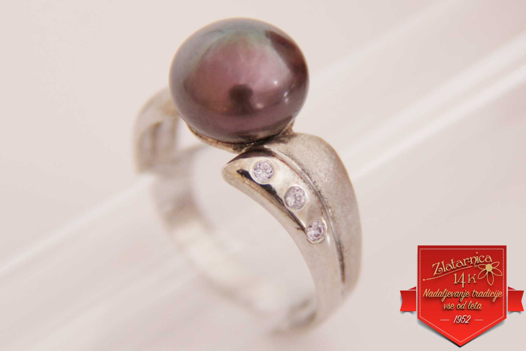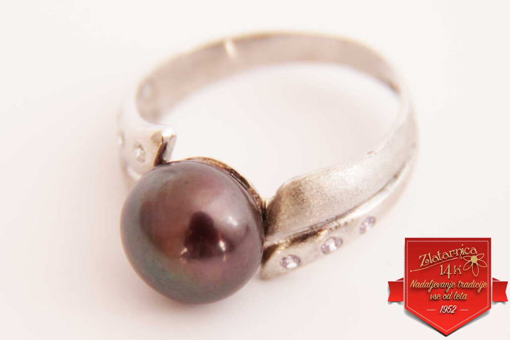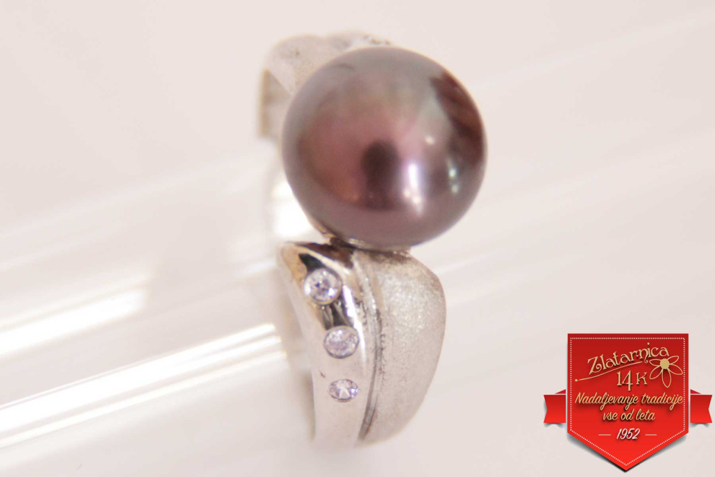 Ženski prstan iz belega zlata s črnim Tahiti biserom, ki ga levo in desno obdajata matirana in polirana dela s cirkoni.