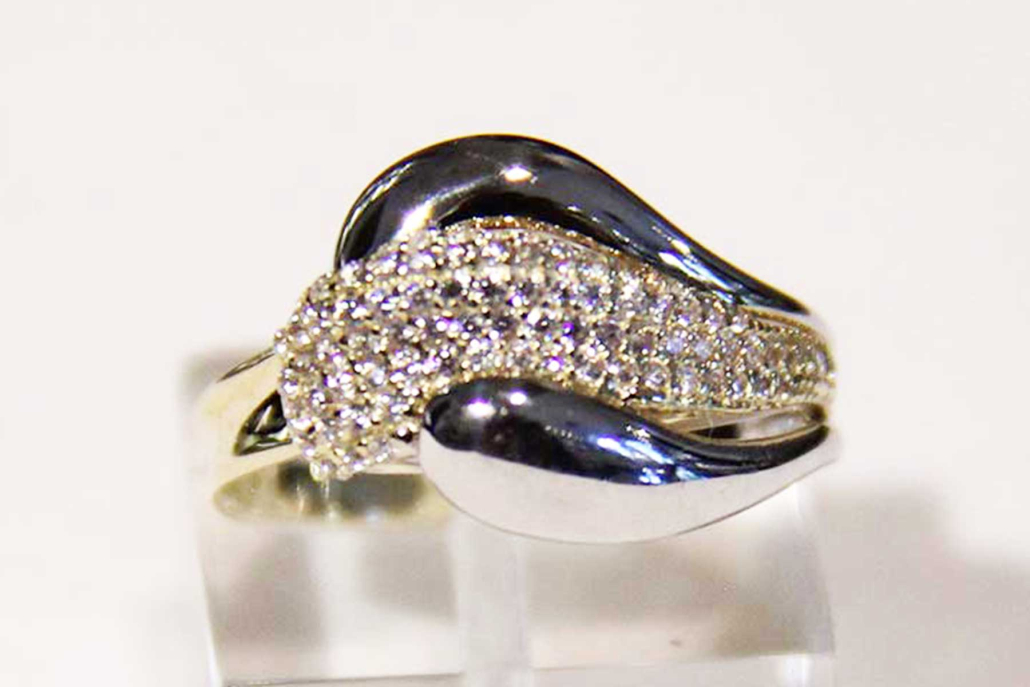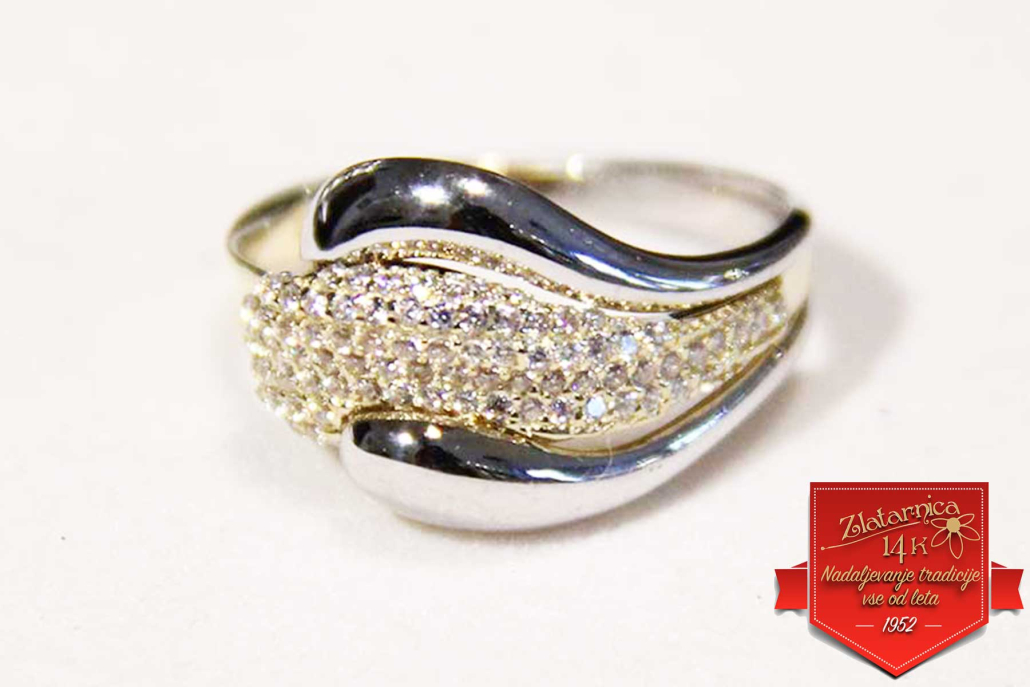 Elegantni ženski prstan iz belega zlata, med katerimi je pas rumenega zlata, v celoti prekrit s vkovanimi cirkoni.