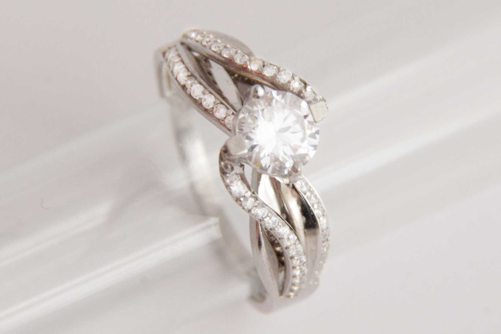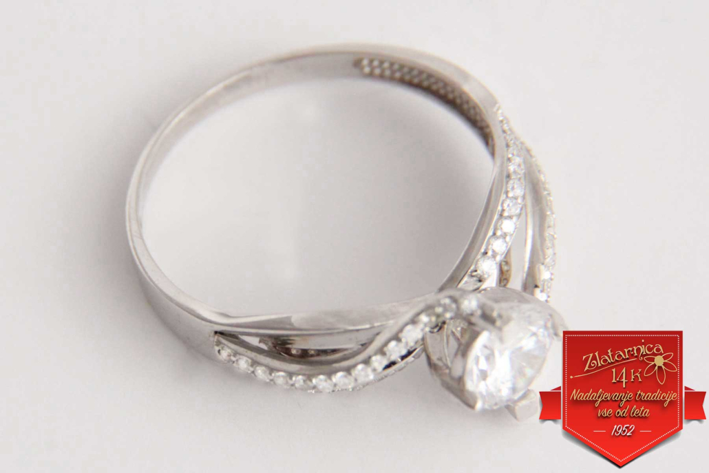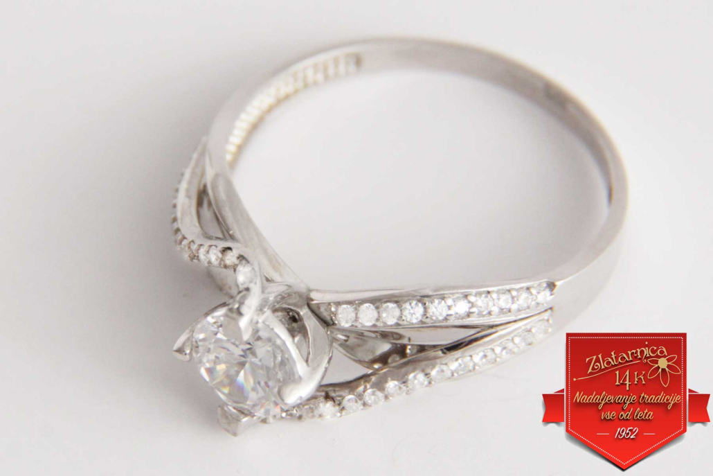 Posebna oblika soliterja z večjim cirkonom, ujetim med dve prekrižani liniji, obdelani z manjšimi cirkoni vzdolž prstana na obeh straneh.