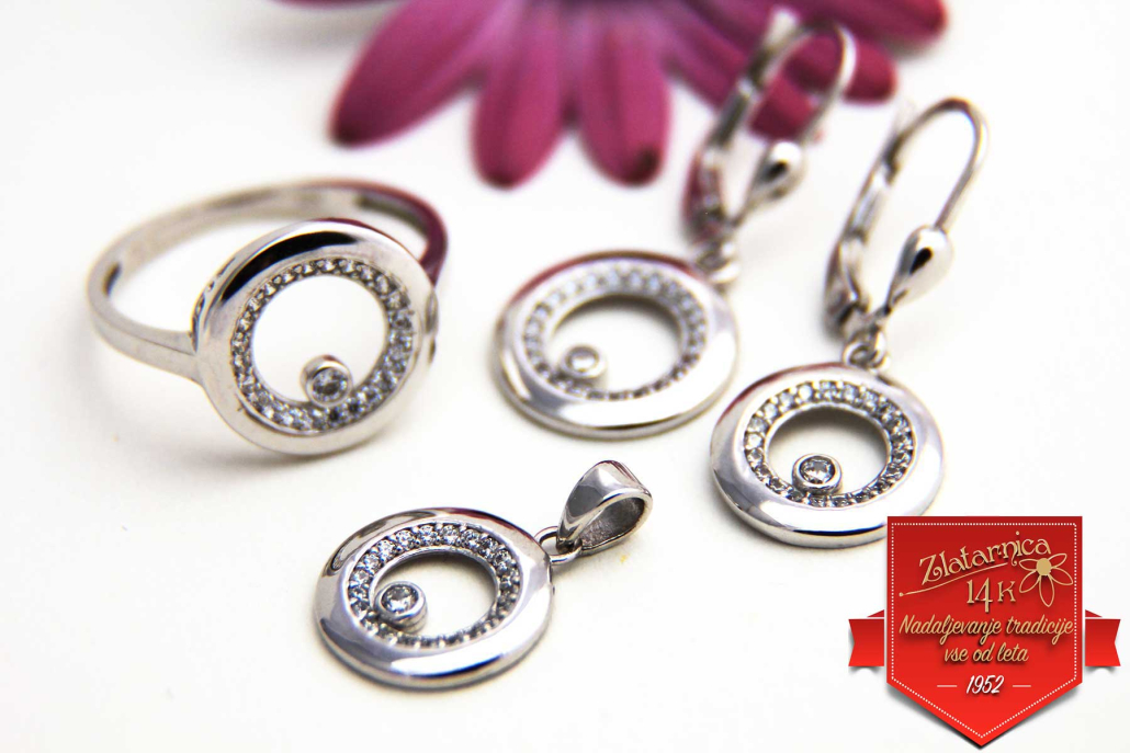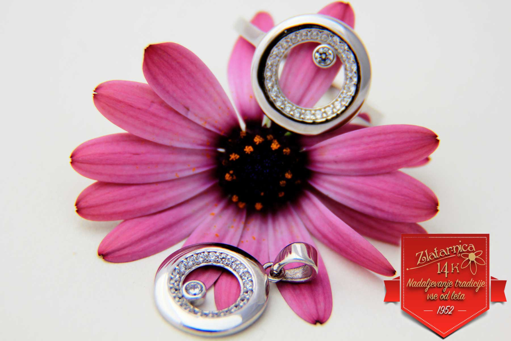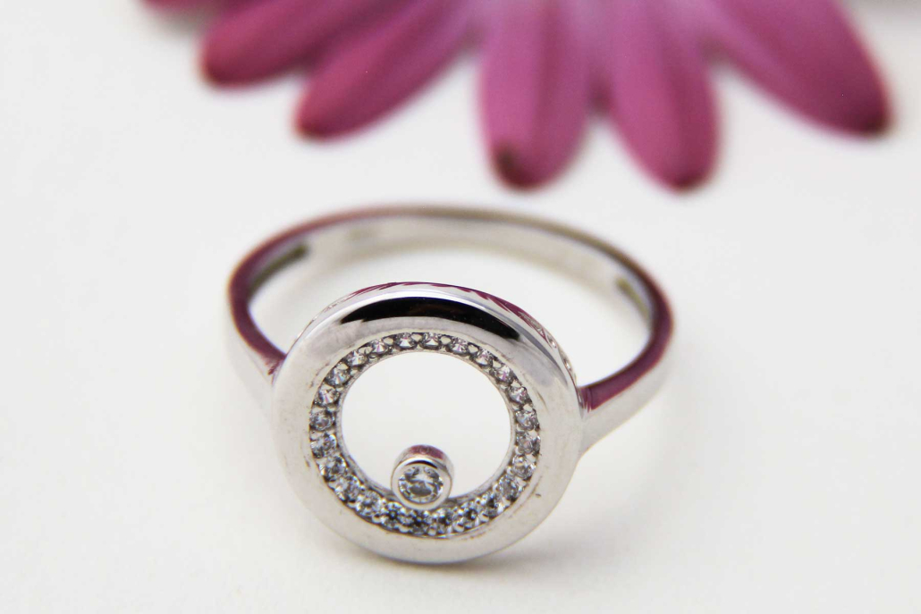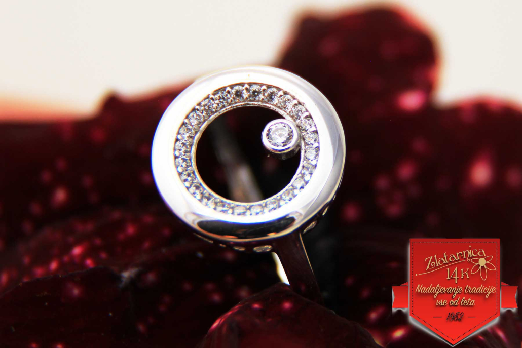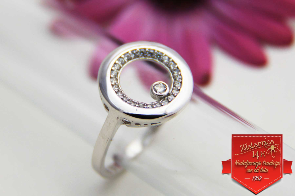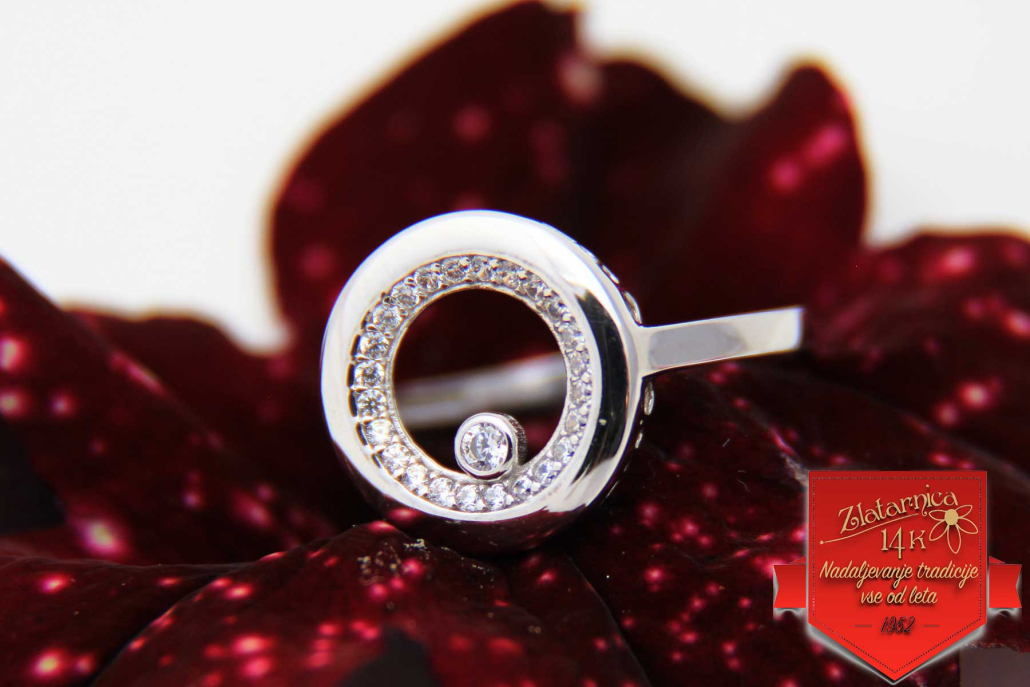 Elegantni prstan z zgornjim delom v obliki kroga, ki je po notranjem delu okovan z manjšimi cirkoni in z večjim, ki iztopa od podlage.