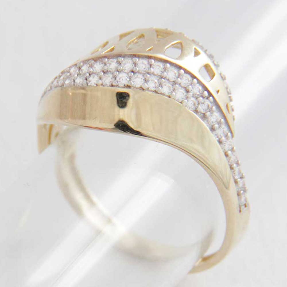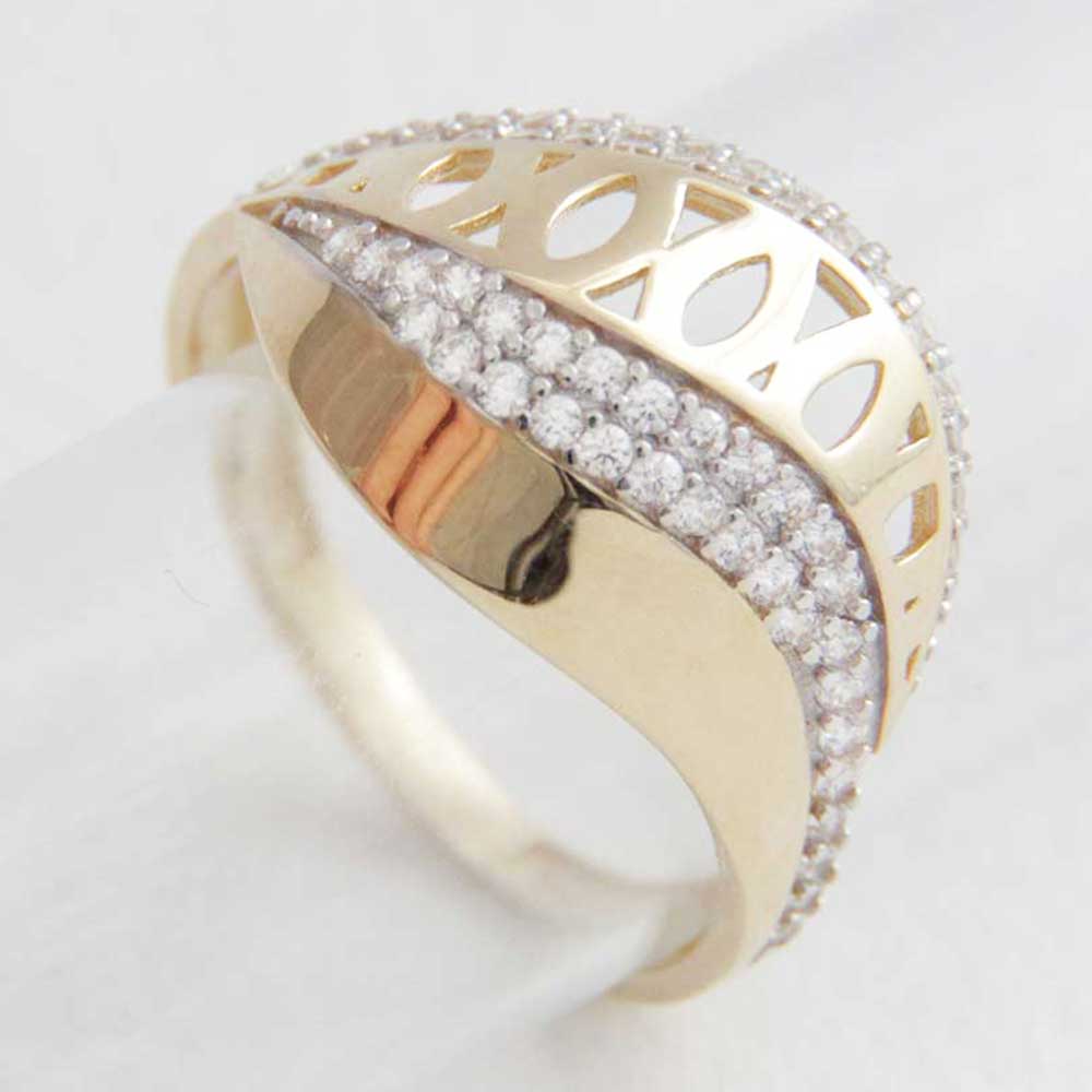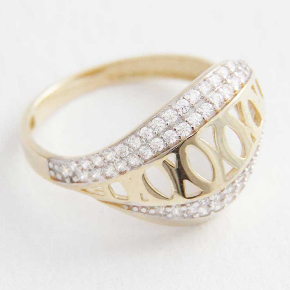 Prstan iz rumenega zlata valovite oblike z izrezljanimi inserti, obdanimi s cirkoni.