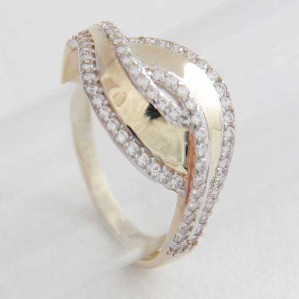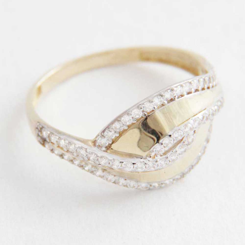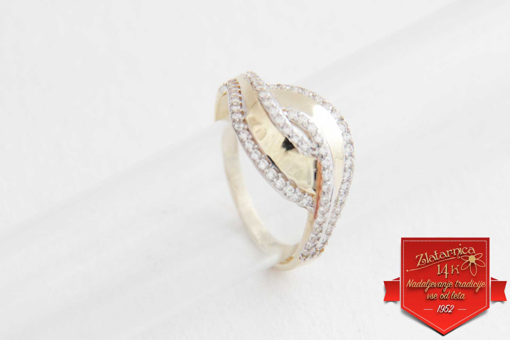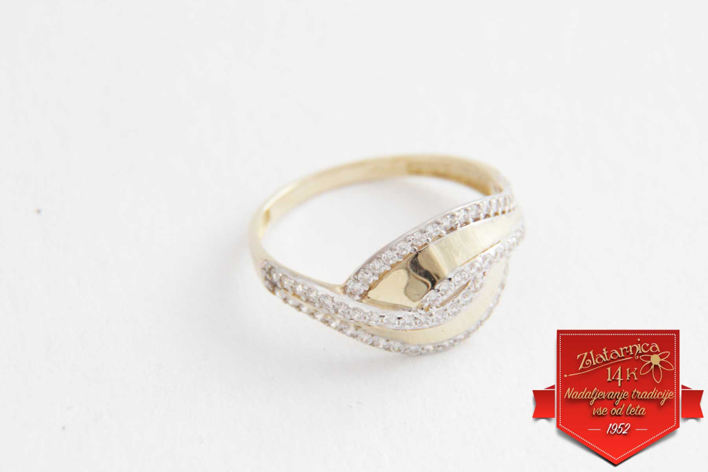 Eleganten prstan iz rumenega zlata, na katerem sta združena polirana pasova in linije s vkovanimi cirkoni.