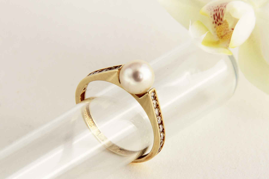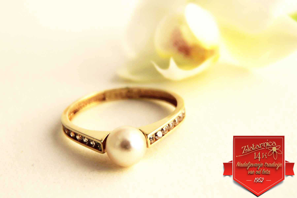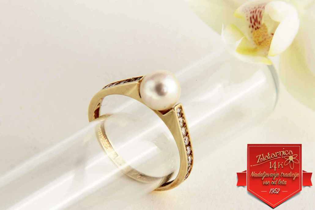 Unikaten prstan iz rumenega zlata z s cirkoni po obroču in s sladkovodnim gojenim biserom bele barve.