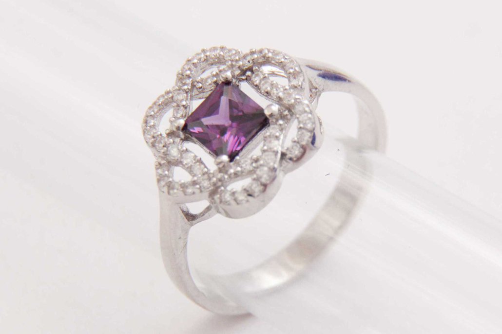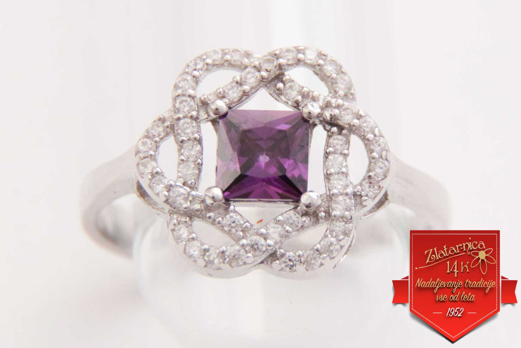 Srebrni prstan s sintetičnim ametistom v obliki cveta, obdan s cirkoni.