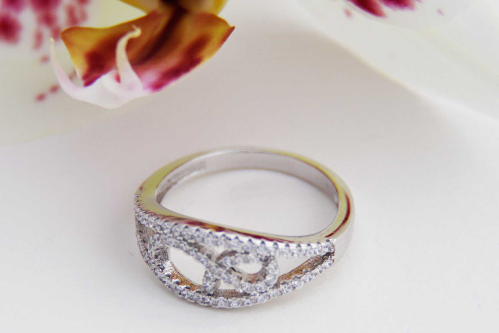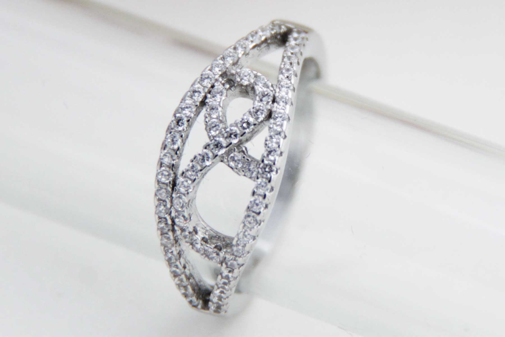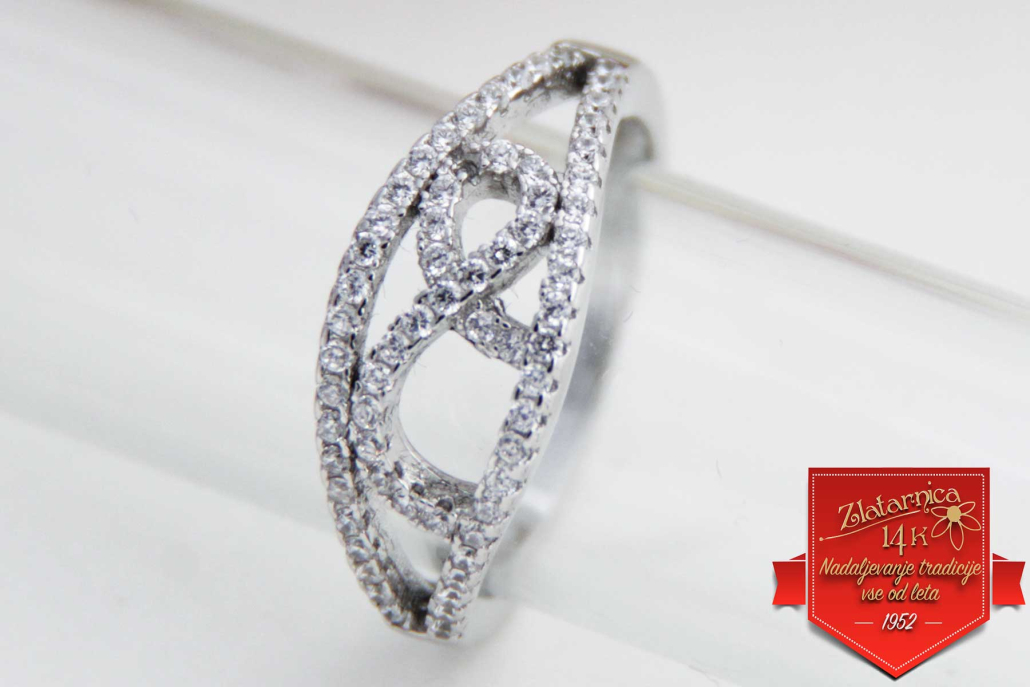 Elegantni prstan iz dveh linij, ki ju vzdolžno loči simbol &. ki jih dopolnjujejo številni cirkoni.