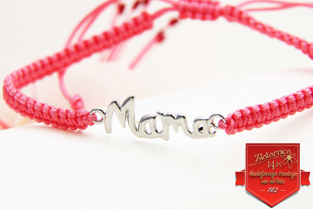 Zapestnica iz pletenega tekstilnega traku roza barve, s srebrnim napisom *Mama* pripetim v sredini.