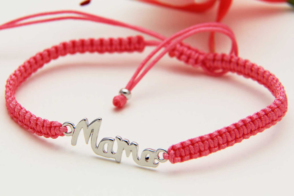 Zapestnica iz tekstilne vrvice z napisom *Mama* v sredini. Izvirno darilo ob rojstvu otroka ali za materinski dan.