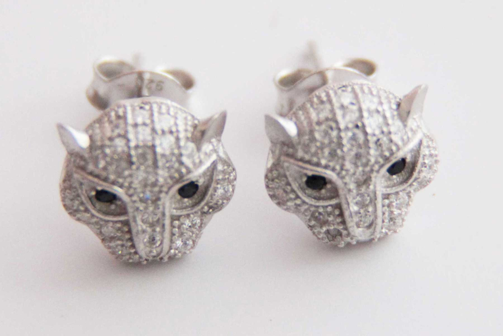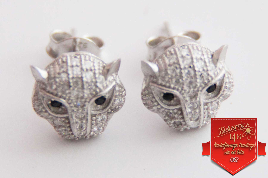 Srebrni uhani v obliki tigrove glave obdelane s cirkoni in safirji.