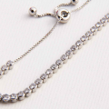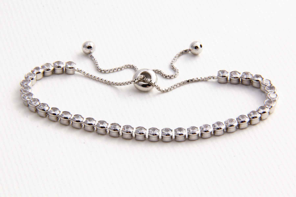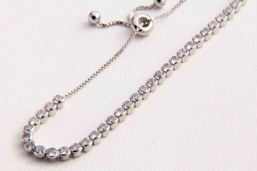 Tenis zapestnica sestavljena iz zaporedno povezanih prosojnih kamnov z verižico in z drsnim elementom, ki ga lahko poljubno zategnete.