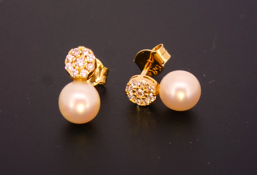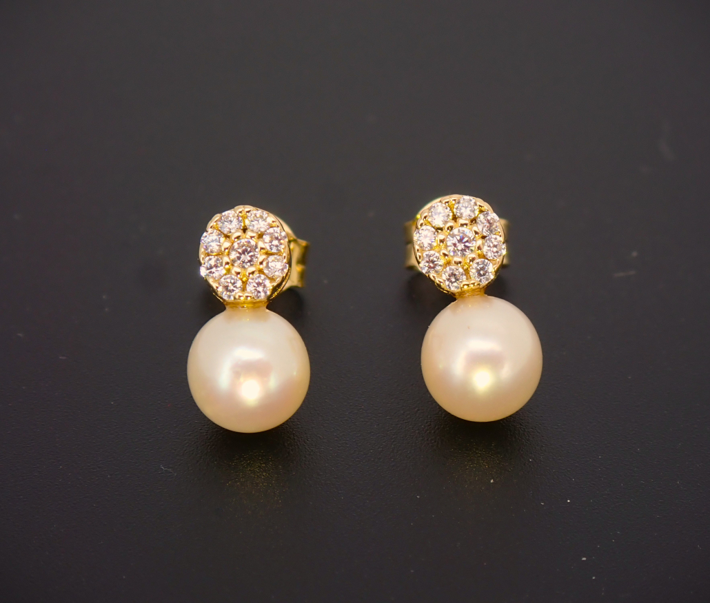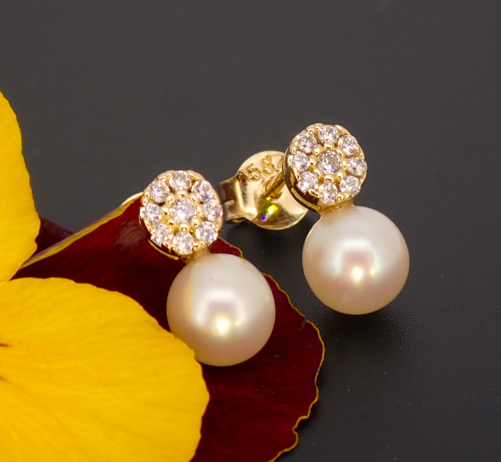 Material: rumeno zlato (585/1000), cirkoni, sladkovodni gojen biser premera 5,5 mm.