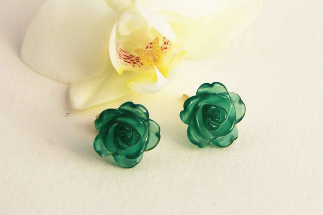 Unikatni uhani s podlogo iz rumenega zlata, z naravnimi zelenimi ahati brušenimi v obliko cveta vrtnice.Zraven se lepo poda tudi enak obesek.