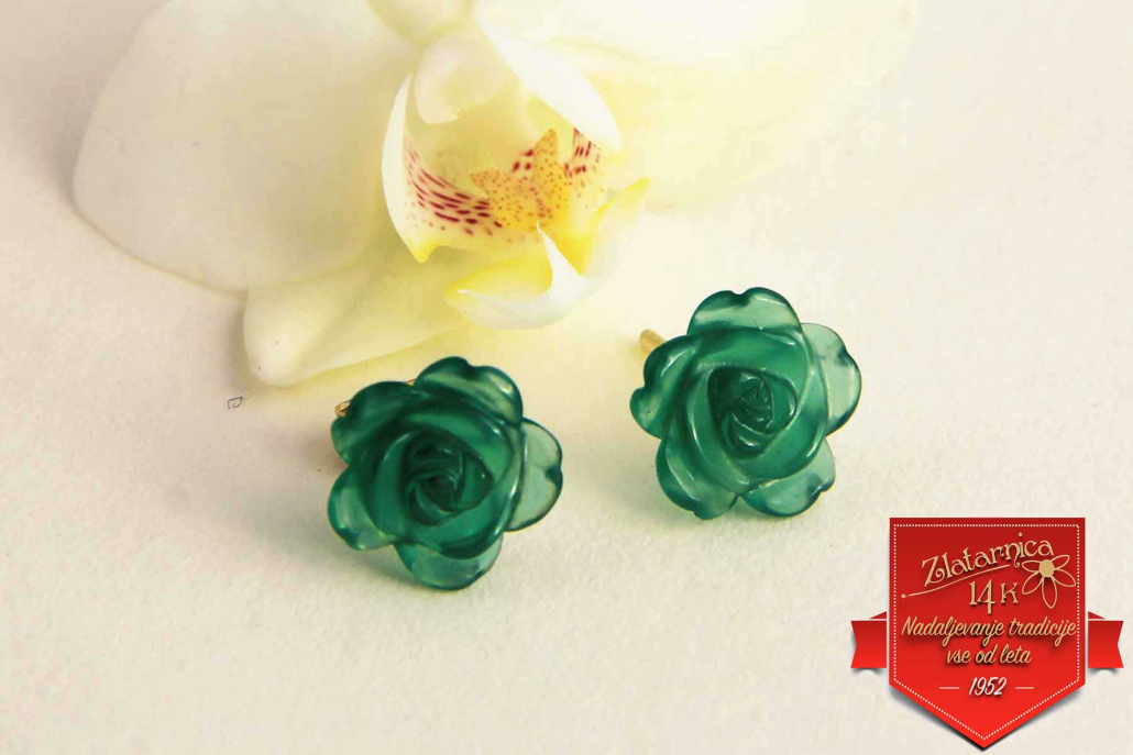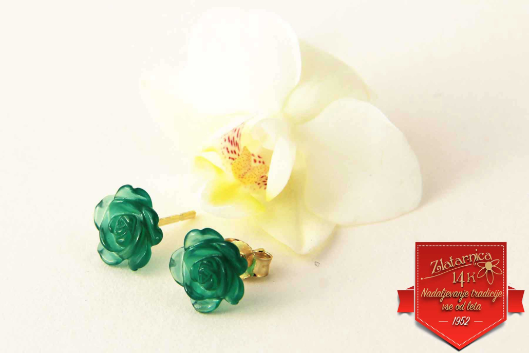 Elegantni uhani iz rumenega zlata s z zelenimi ahati v obliki vrtnice.