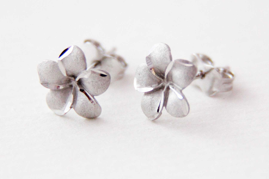Uhani v obliki bogatega cveta krizanteme iz belega zlata, s peskano podlago in diamantiranimi robovi.