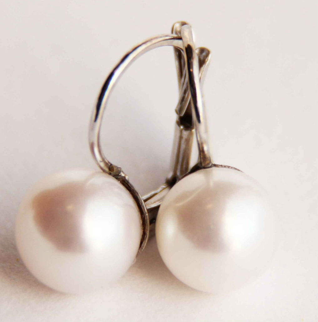 Polviseči uhani z zapiranjem na patent, z belimi sladkovodnimi gojenimi biseri.