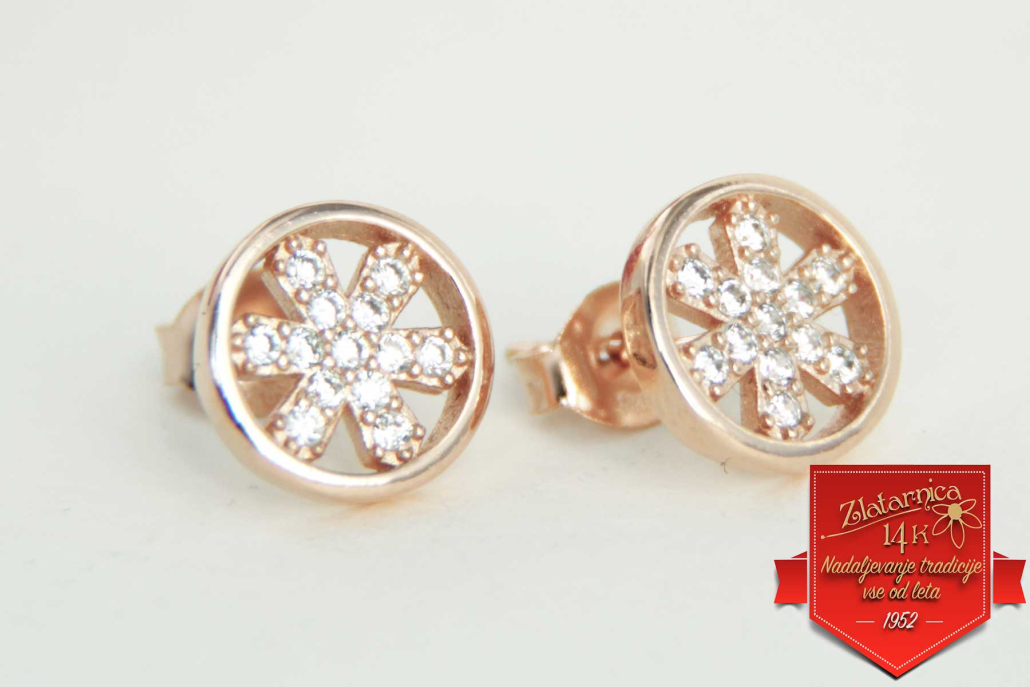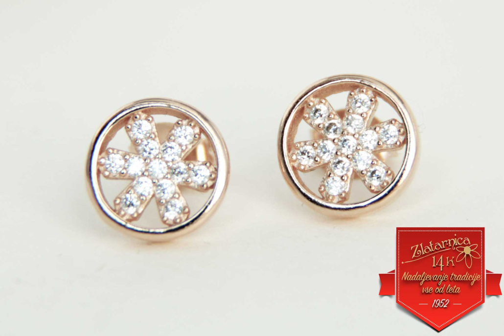 Modni srebrni uhani z rose pozlato v obliki kroga s cvetom, po katerem so vkovani cirkoni.