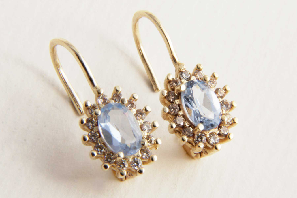 Material: rumeno zlato (585), beli cirkoni in sintetični akvamarin.