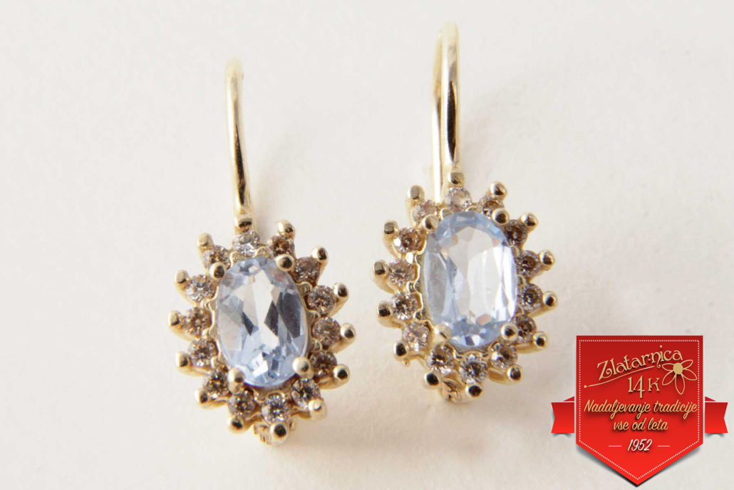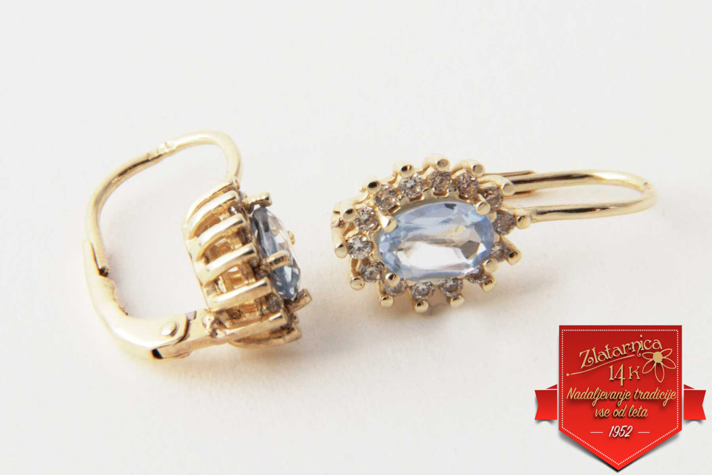 Polviseči uhani iz rumenega zlata z zapiranjem na patent. Ovalni obod sestavljajo beli cirkoni, na sredini pa je vkovan svetlo moder akvamarin.