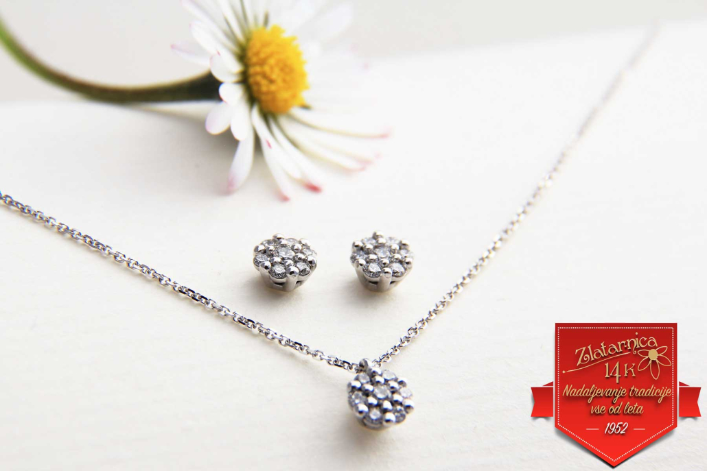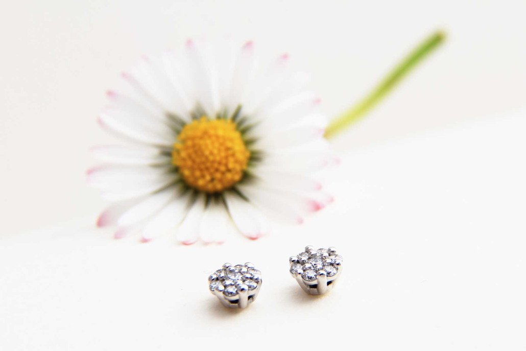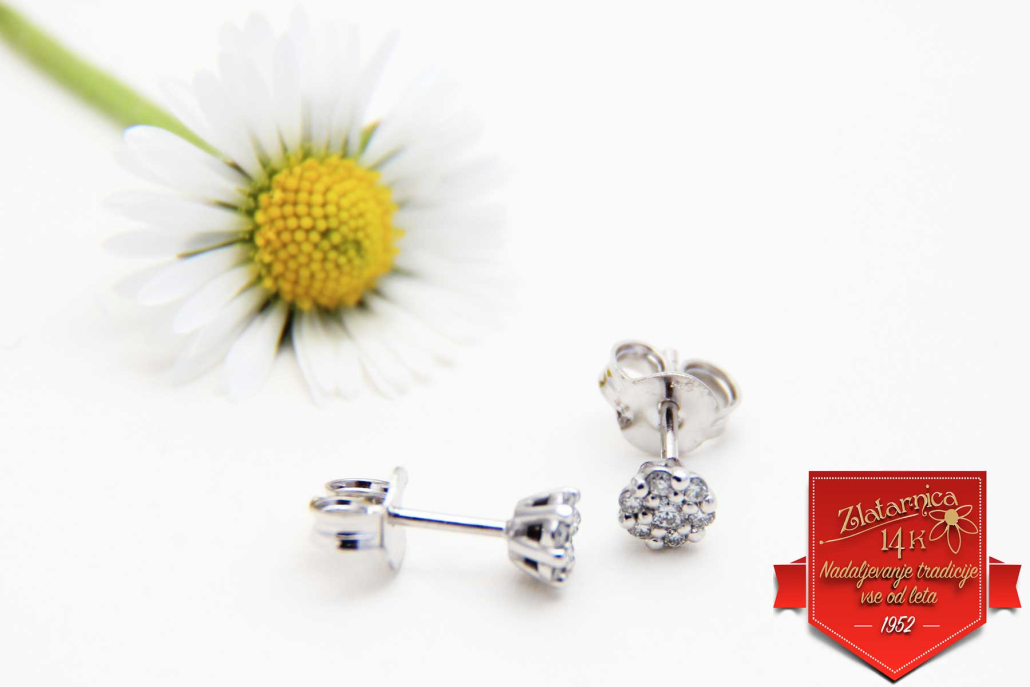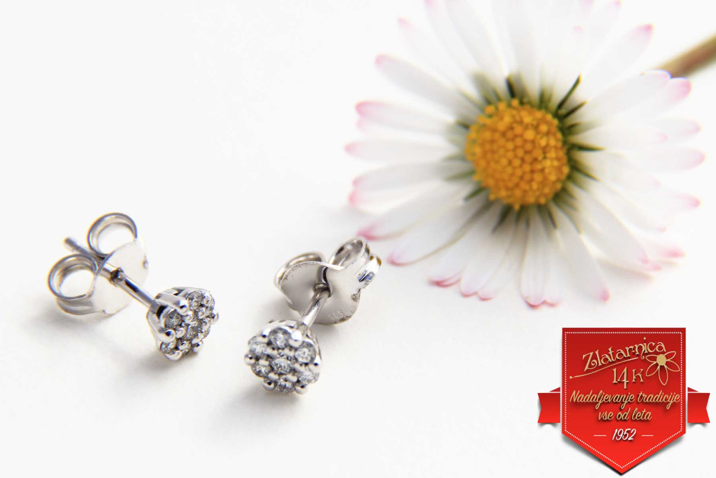 Prefinjeno izdelani uhani v obliki cveta okovanega z briljanti, s priloženim certifikatom o kakovosti in pristnosti.