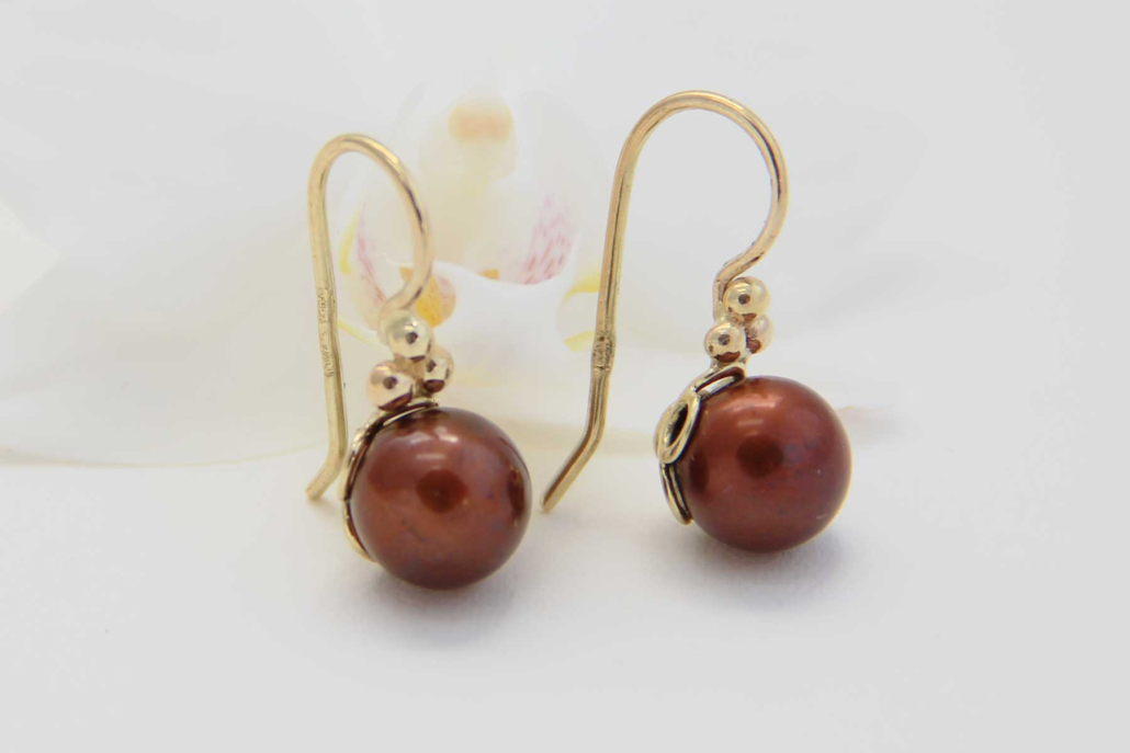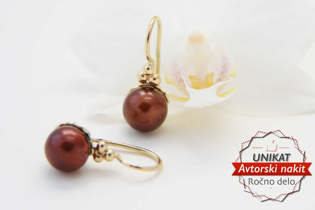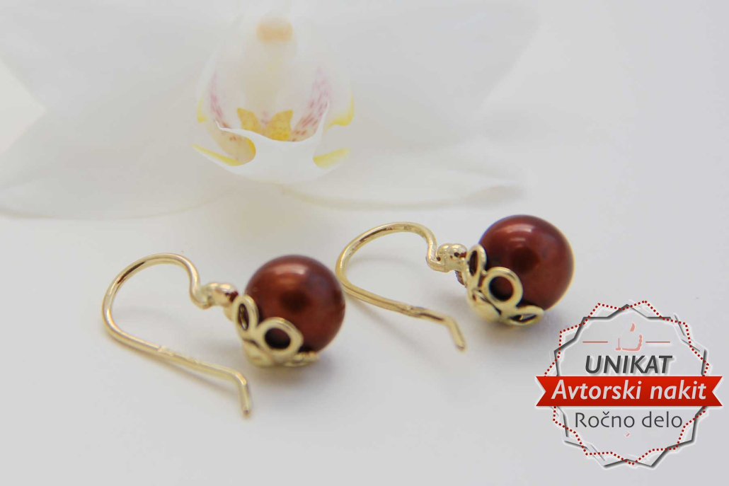 Unikatni, ročno izdelani uhani iz rumenega zlata na kavelj, z gojenimi sladkovodnimi biseri rjave barve.
