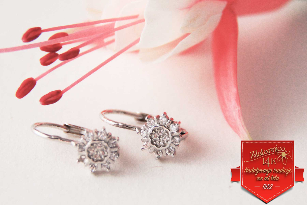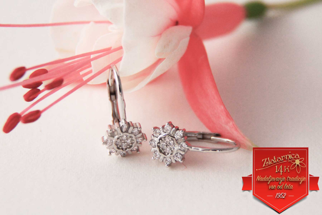 Srebrni uhani s okroglo plošćico na patent s cirkoni.
