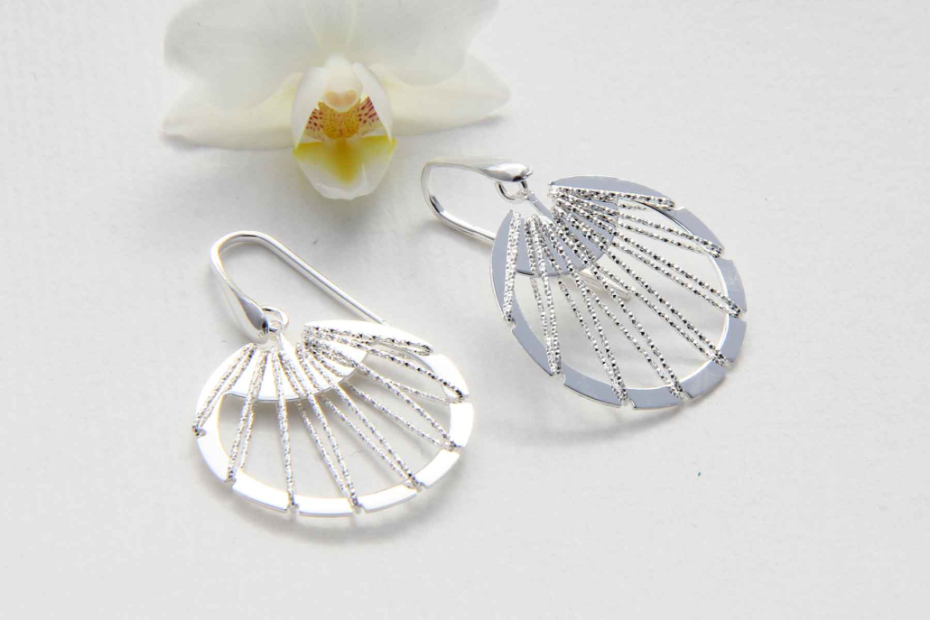 Srednje veliki srebrni uhani z diamantiranimi žicami ki so pripete čez krog. Prepletajoči liki ustvarjajo posebno elegantnco.