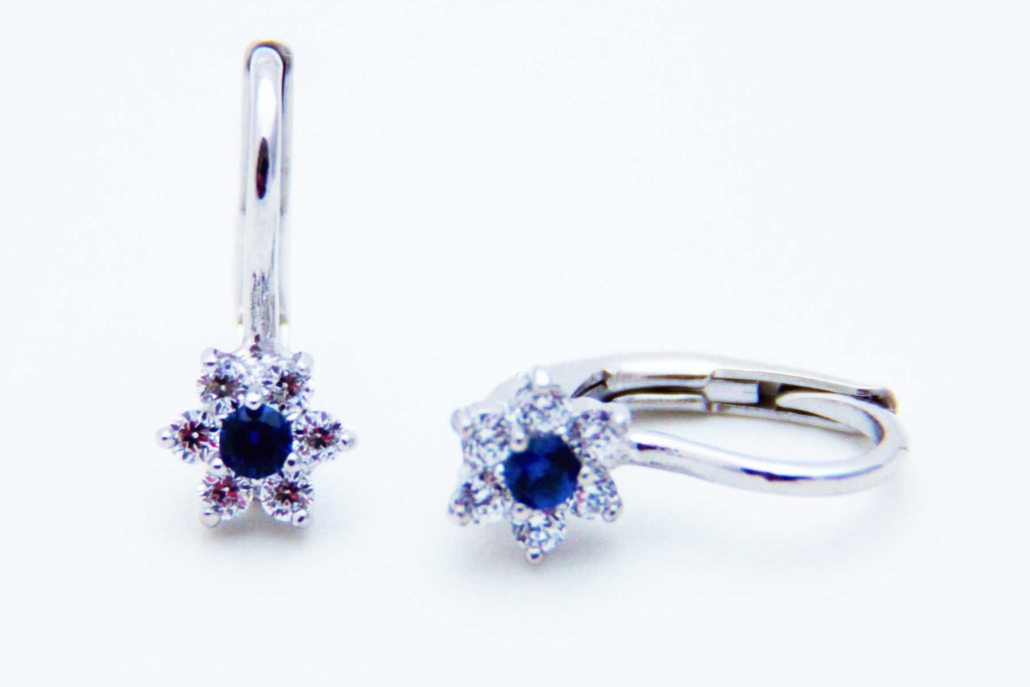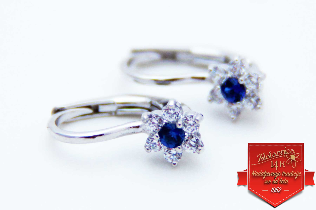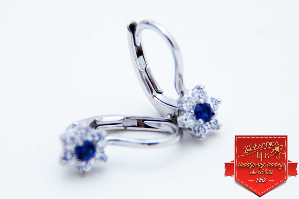 Polviseči uhani na patent v obliki cveta iz belega zlata, s safirjem v sredini, okoli katerega so vkovani cirkoni.