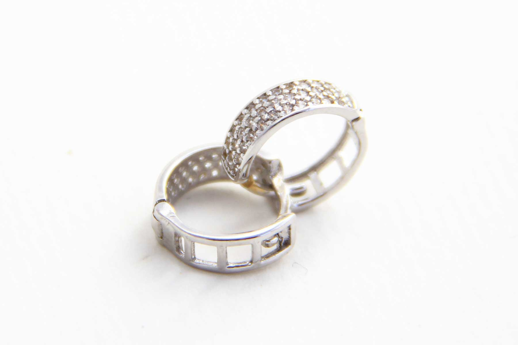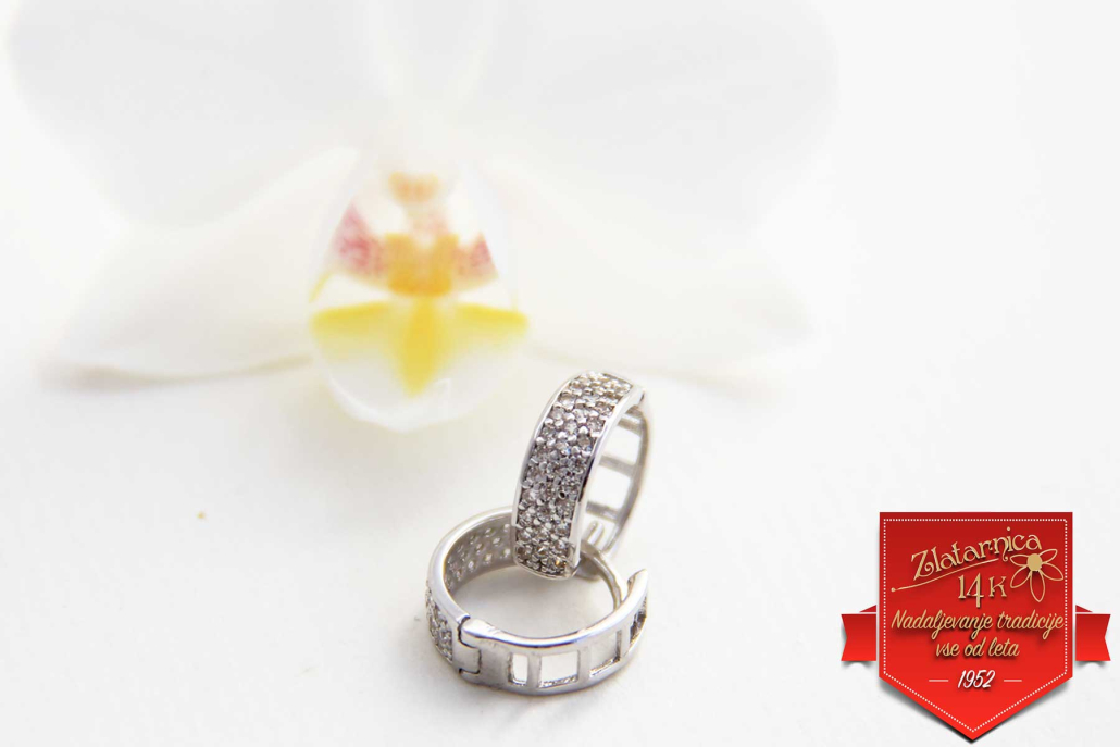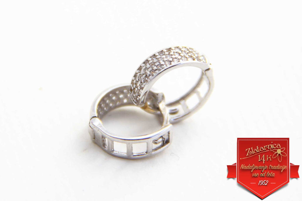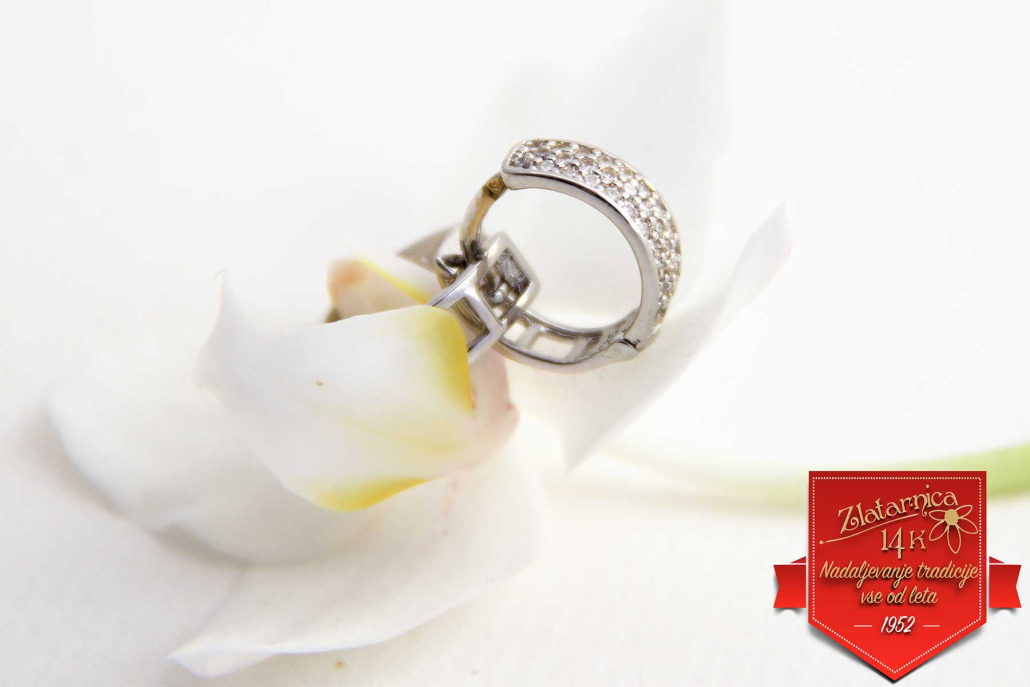 Uhani v obliki obročka iz belega zlata, z odpiranjem na zglob. Sprednji ploskvi sta obdelani s cirkoni, zadnje pa so iz zaporednih treh kvadrov.