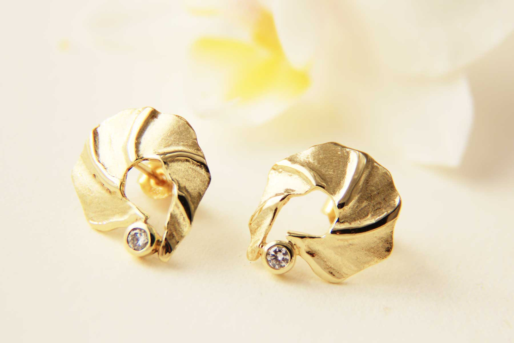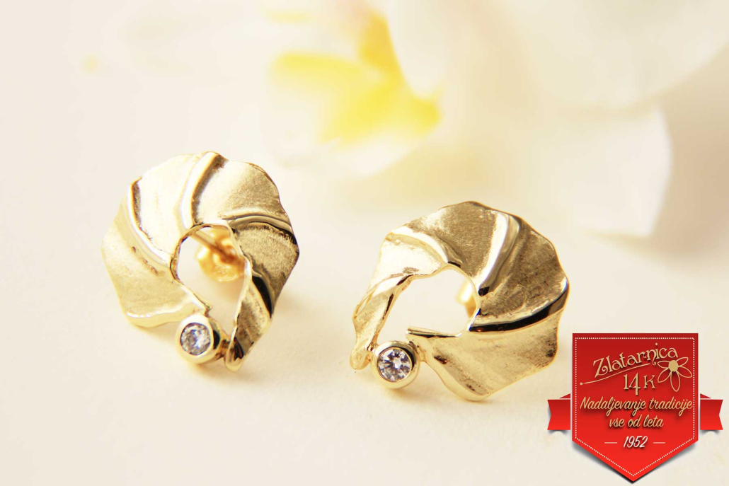 Uhani iz rumenega zlata sestavljeni iz polkrožnih linij v obliki fosila s cirkonom na zaključku.