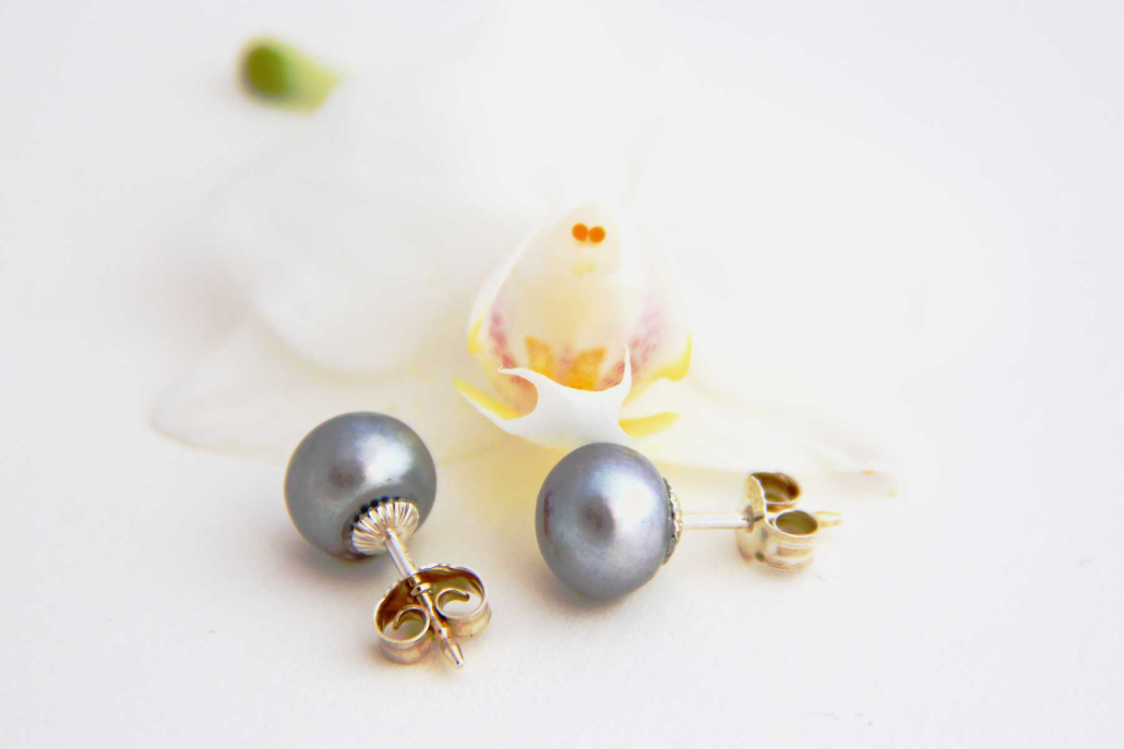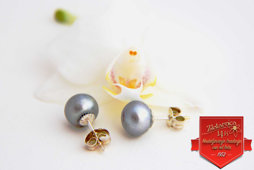 Srebrni uhani z naravnimi sladkovodnimi biseri sivega odtenka.