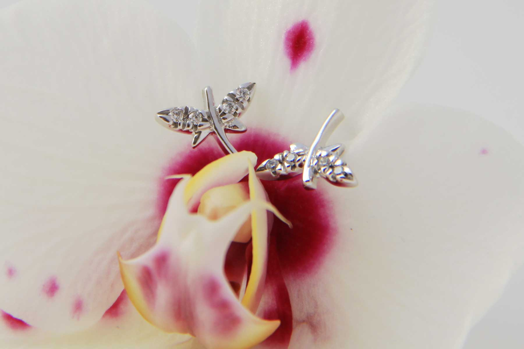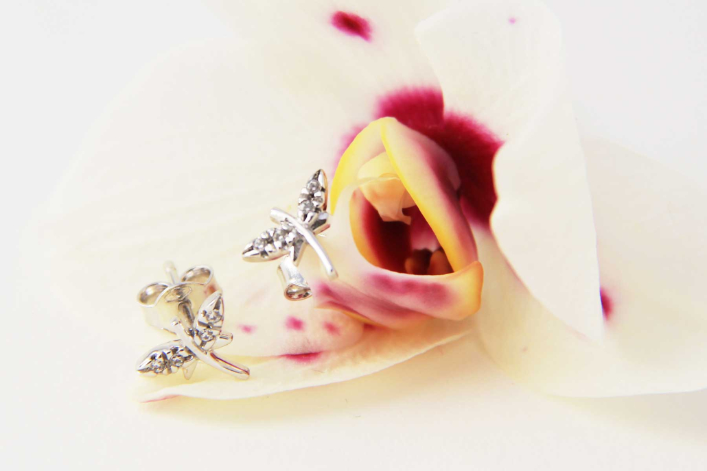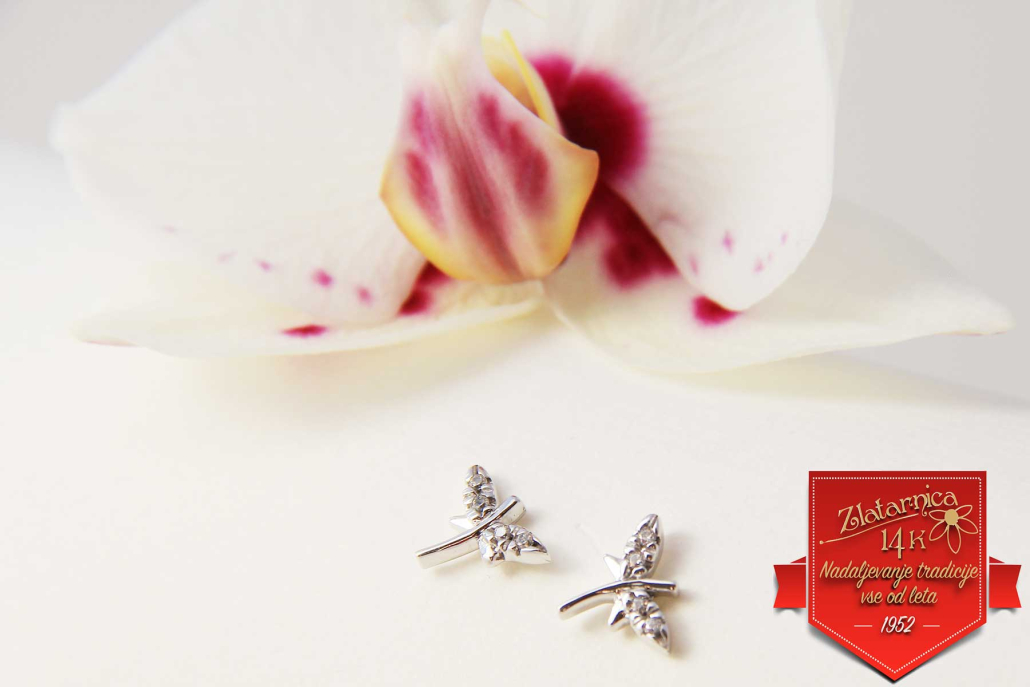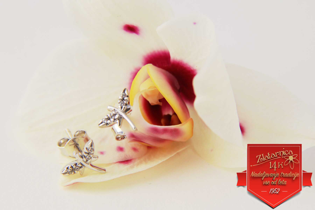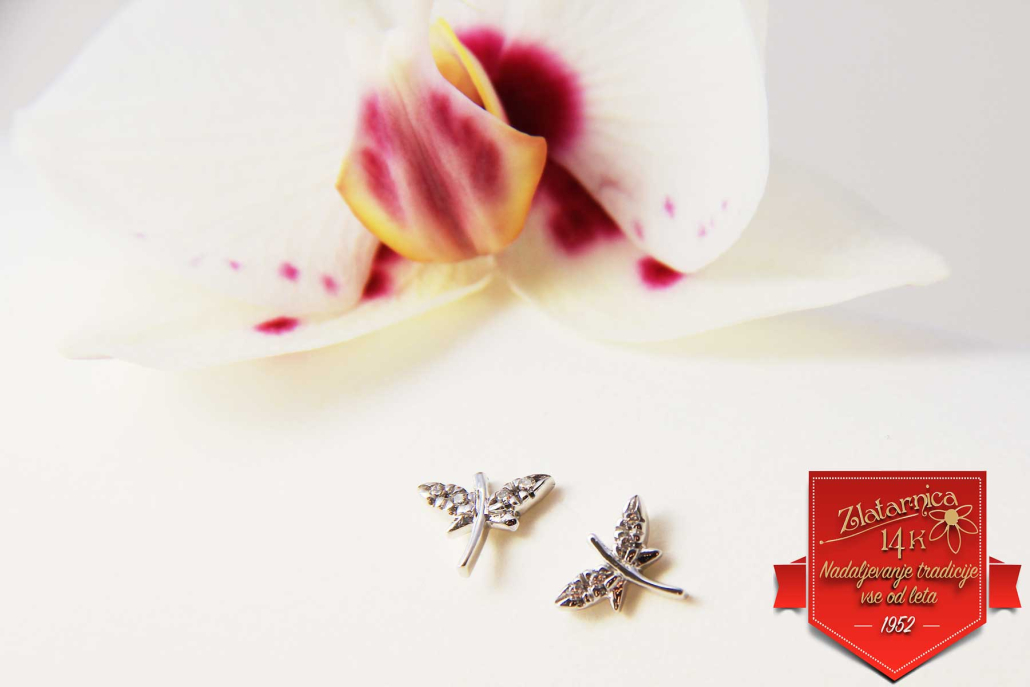 Ljubki uhani iz belega zlata v obliki kačjega pastirja s vkovanimi cirkoni na krilih.