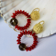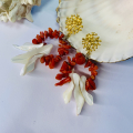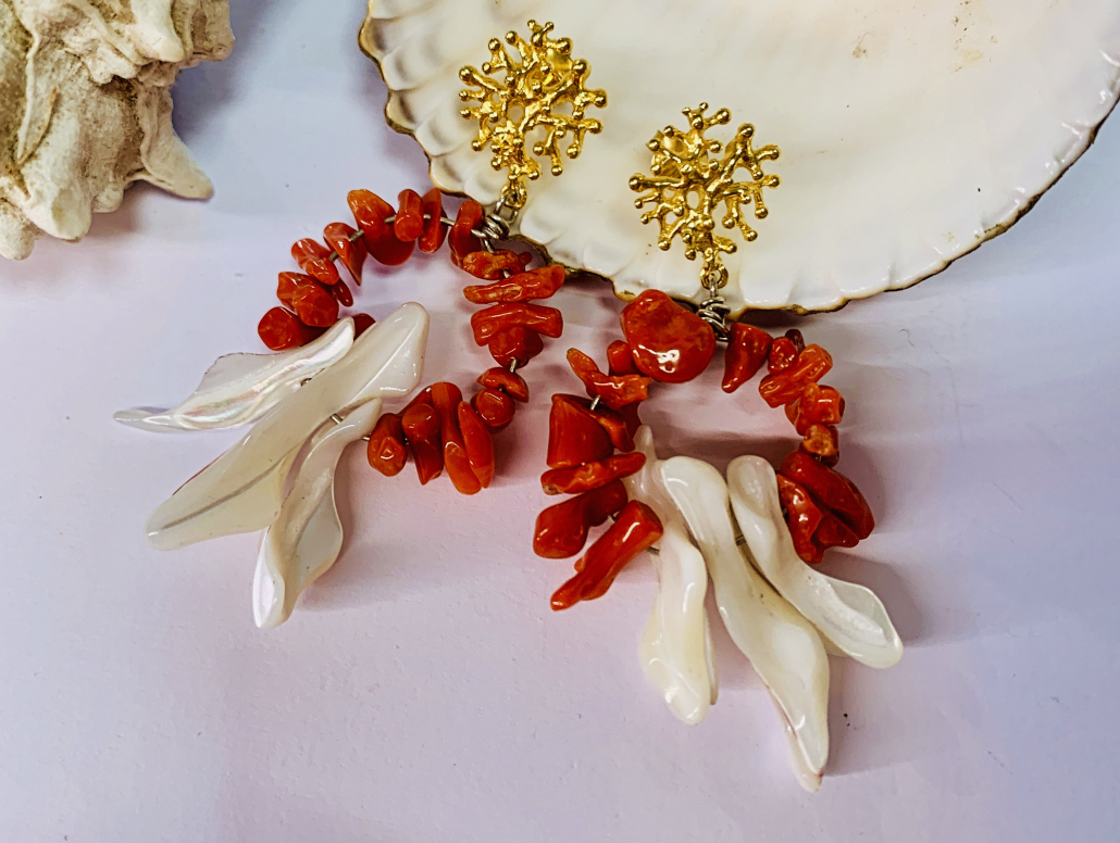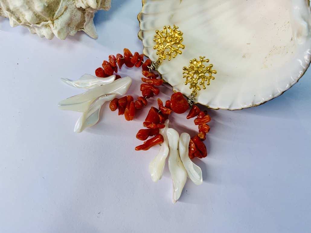 Unikatni srebrni uhani s pozlačeno osnovo in z naravnimi koralami in biserno matico na visečem obroču.