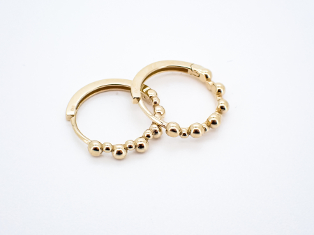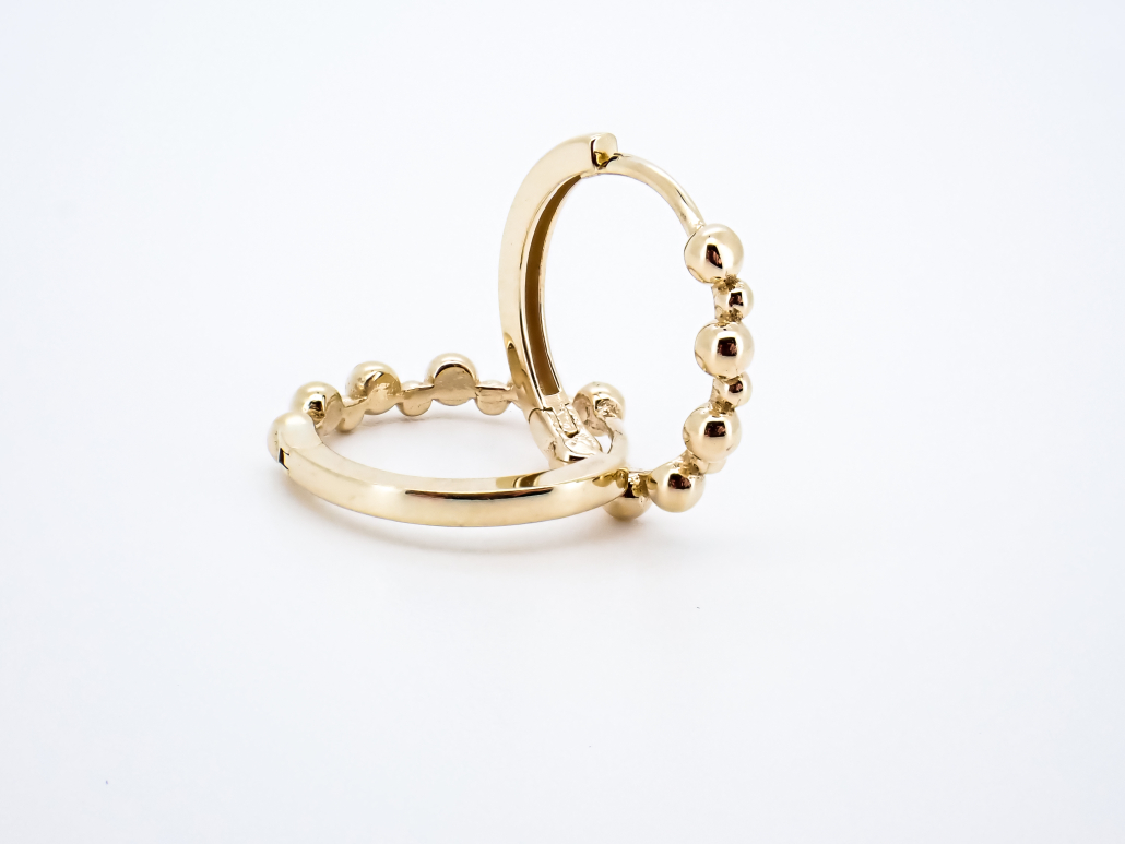 Okrogli uhani iz rumenega zlata, z odpiranjem na zglob. Sprednja stran uhana je sestavljena iz krogljic, zadaj pa je gladka.