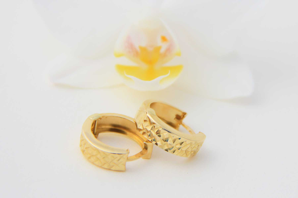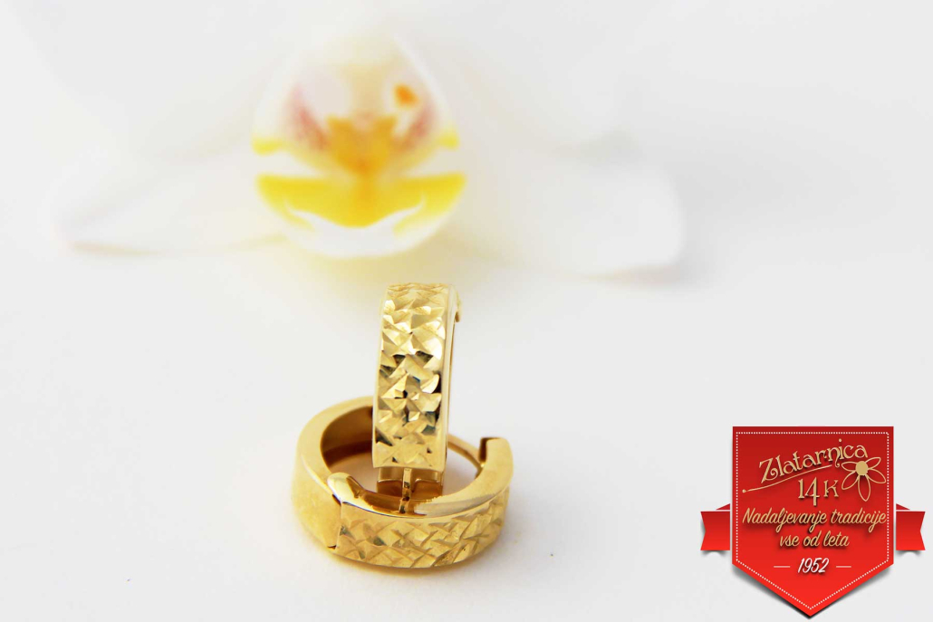 Okrogli uhani iz rumenega zlata, z odpiranjem na zglob. Površina uhana je spredaj obdelana z gravuro, zadaj pa svetleča.