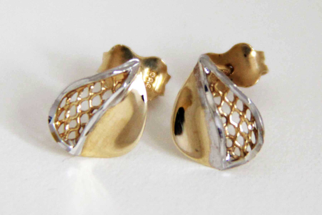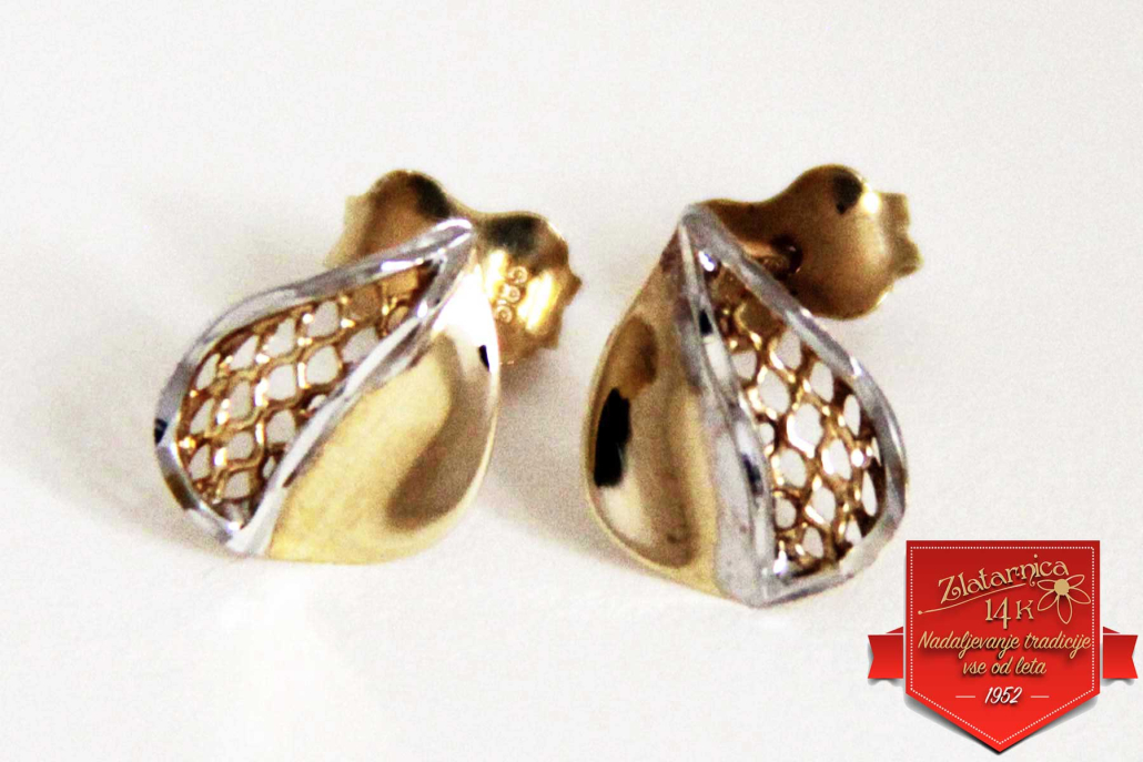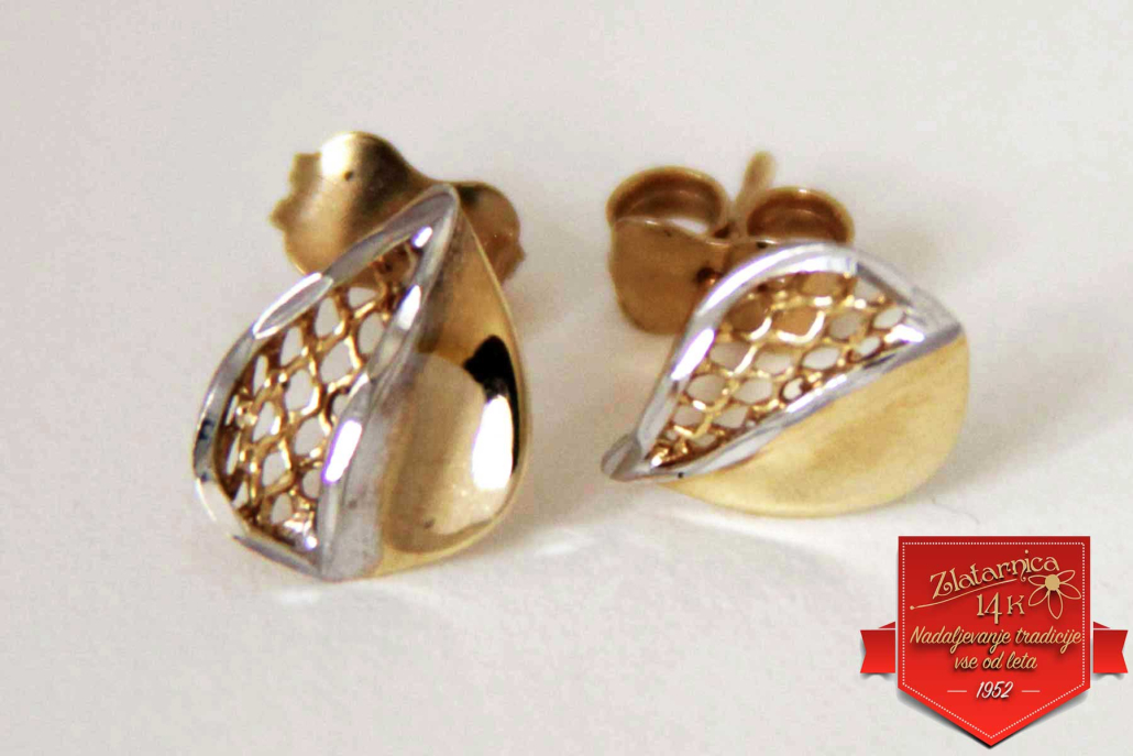 Uhani iz rumenega zlata, v obliki lista z mrežastim delom in obrobo iz belaga zlata.