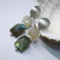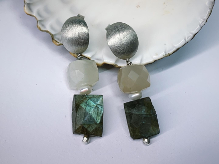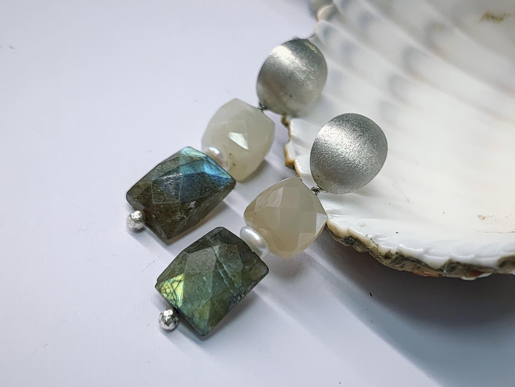 Unikatni uhani z visečimi naravnimi labradoriti, mesečevimi kamni in naravnimi sladkovodnimi biseri.