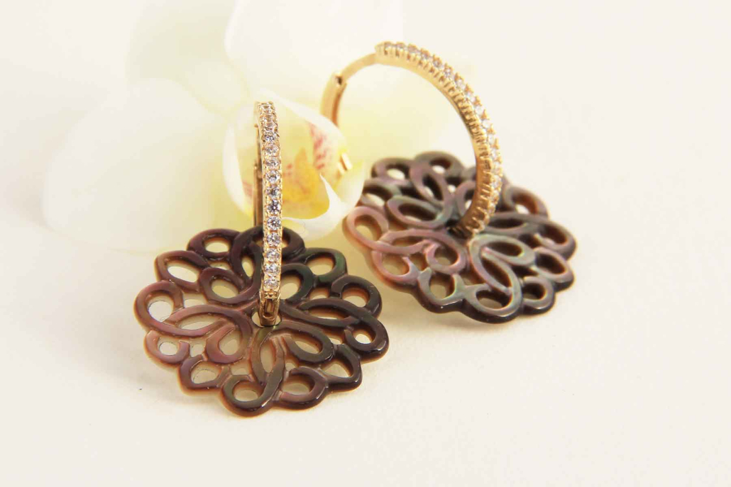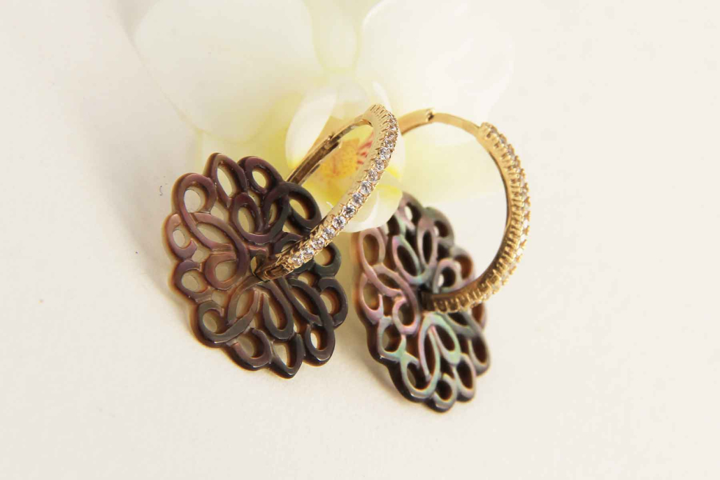 Čudoviti uhani v obliki obročkov, spredaj okovanimi s cirkoni, na katerih visi črna biserna matica v obliki mandale, ki jo lahko tudi snamete.