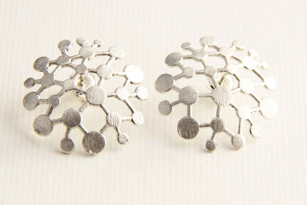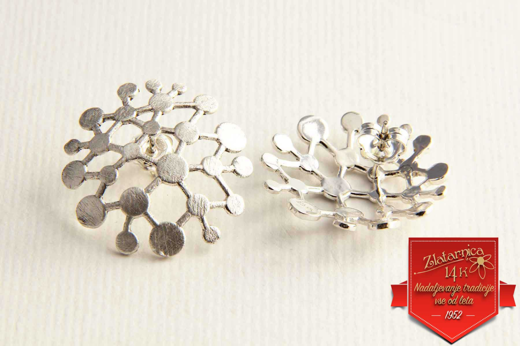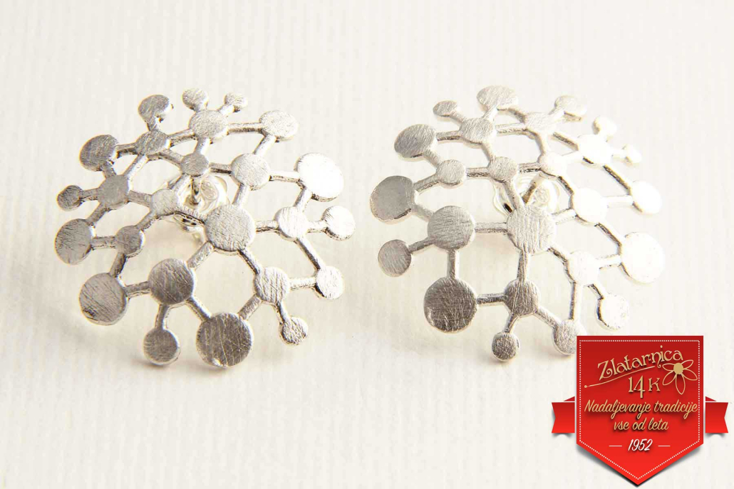 Elegantni srebrni uhani z molekularnim vzorcem v krogu.