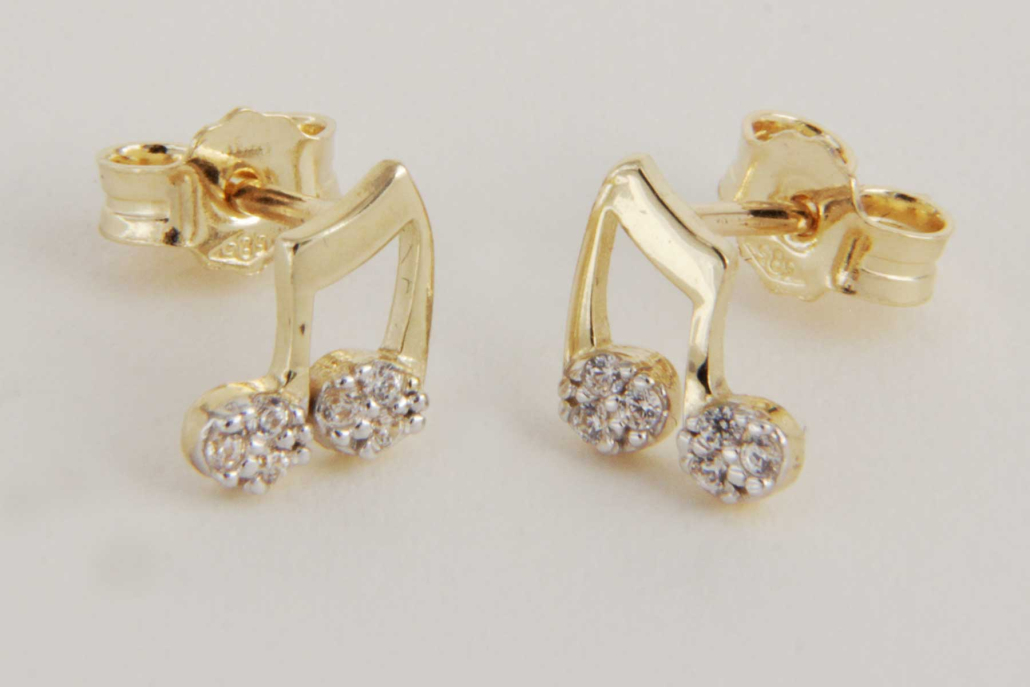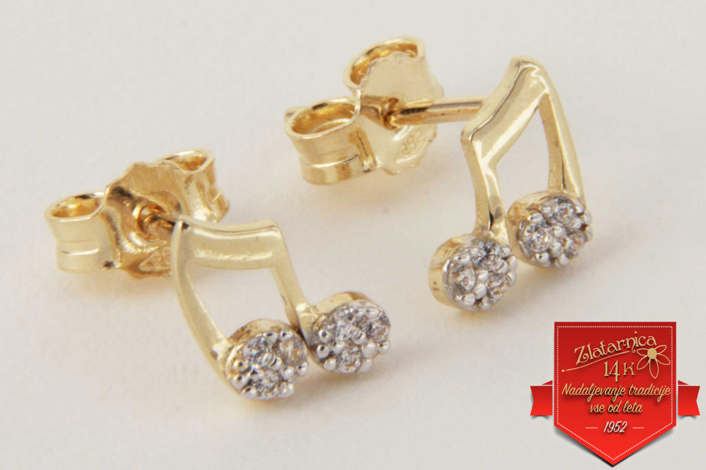 Uhani iz rumenega zlata v obliki note s cirkoni na zaključkih.