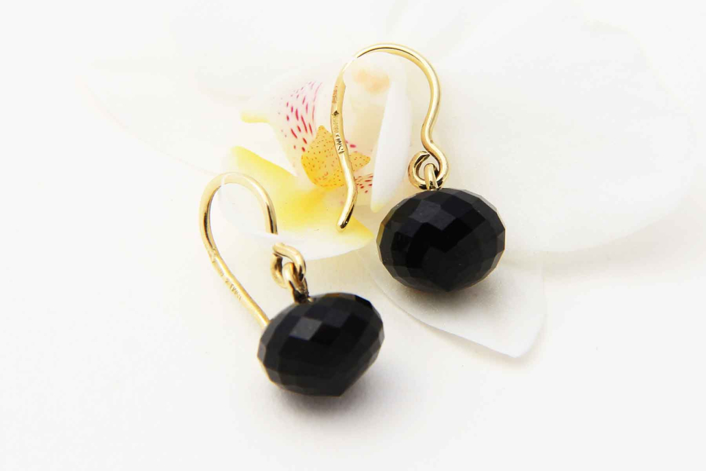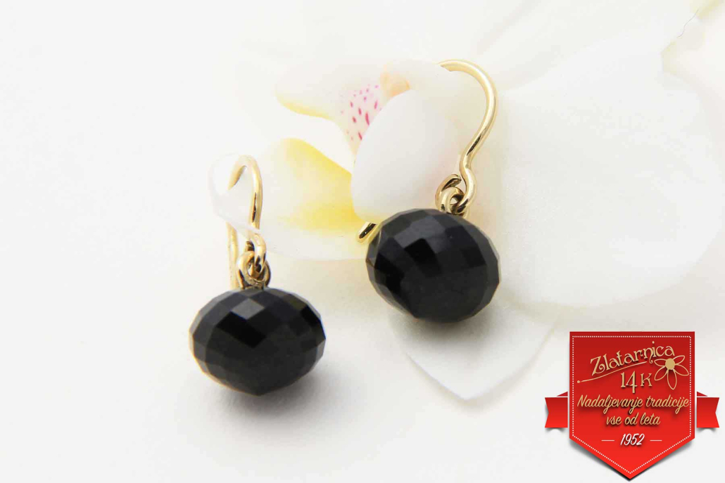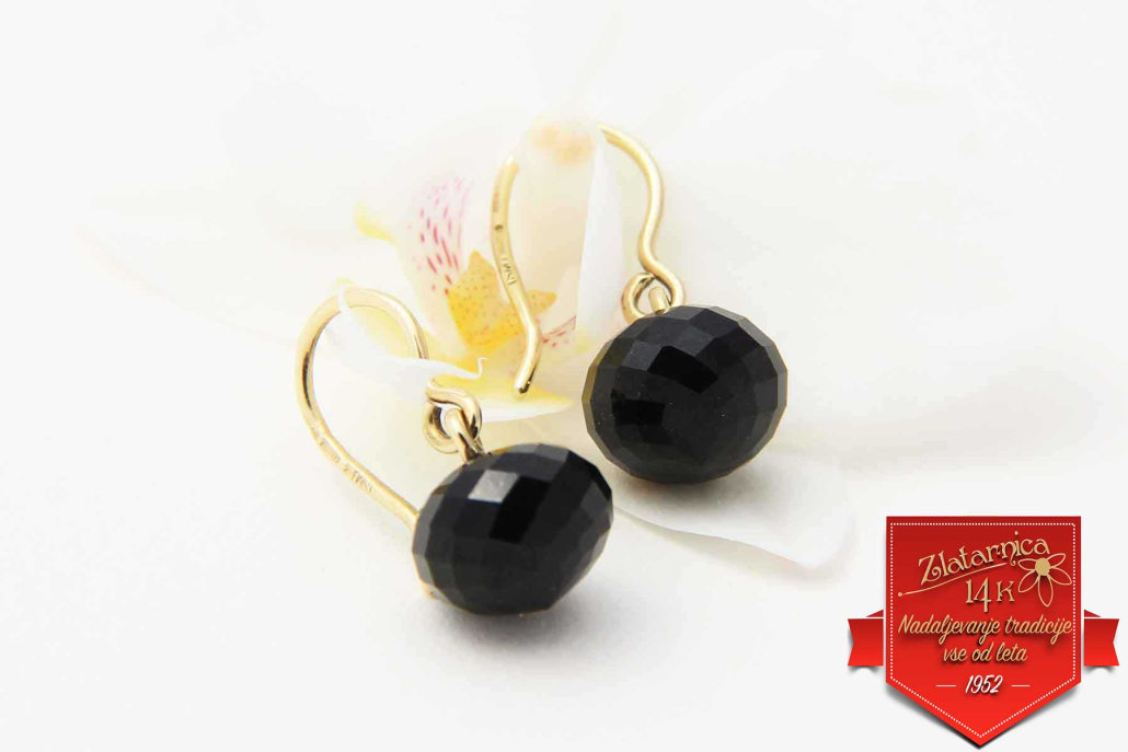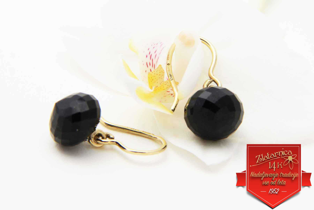 Unikatni uhani iz rumenega zlata z črnimi oniksi brušeni v obliko čebule.