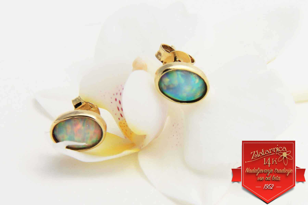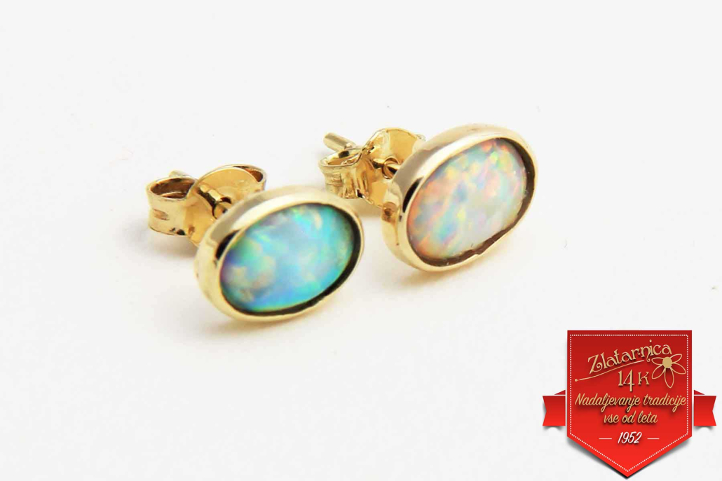 Klasični uhani iz rumenega zlata z mlečnim opalom ovalne oblike, z zapiranjem na švedski patent.