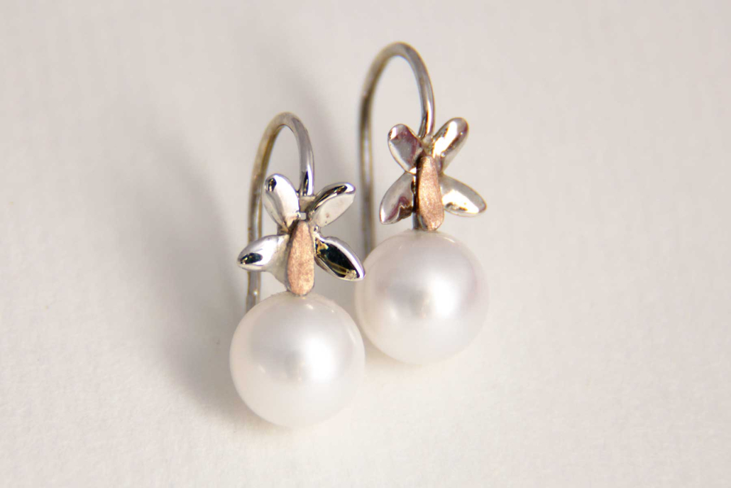 Unikatni, ročno izdelani uhani iz kombinacije belega in rose zlata, z belimi sladkovodnimi, gojenimi biseri, ki imajo nežen roza barvni ton.