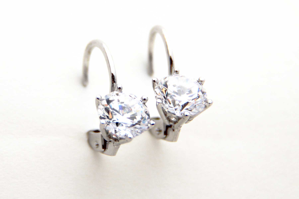 Elegantni uhani iz belega zlata na patente z velikim cirkonom, vstavljenim med stebričke.
