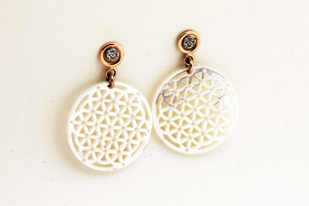 Unikatni uhani sestavljeni iz okrogle ploščice okovane s cirkoni iz belega zlata in obodom iz rose zlata na katerem je obešena bela biserna matica, brušena v okliki Rože življenja.