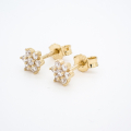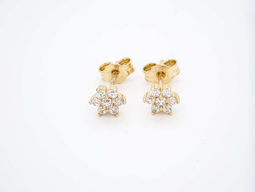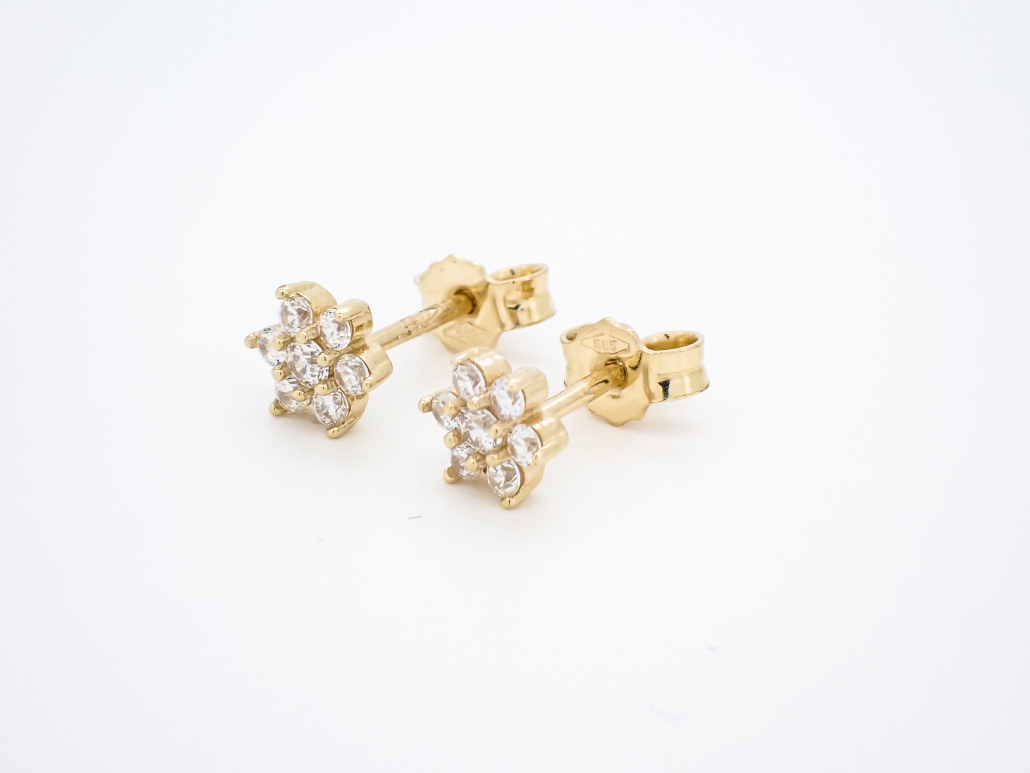 Ljubki uhani iz rumenega zlata s kamenčki postavljenimi v obliko rožice.