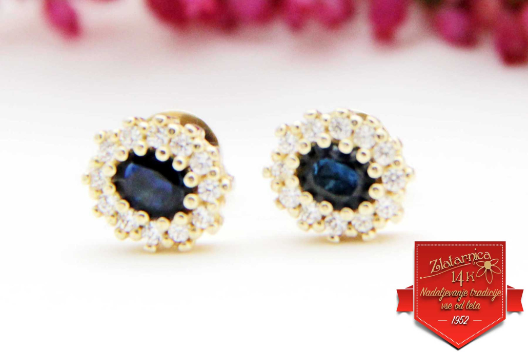 Klasični uhani iz rumenega zlata z zapiranjem na navoj. Ovalni obod sestavljajo beli cirkoni, na sredini pa je vkovan modri safir.