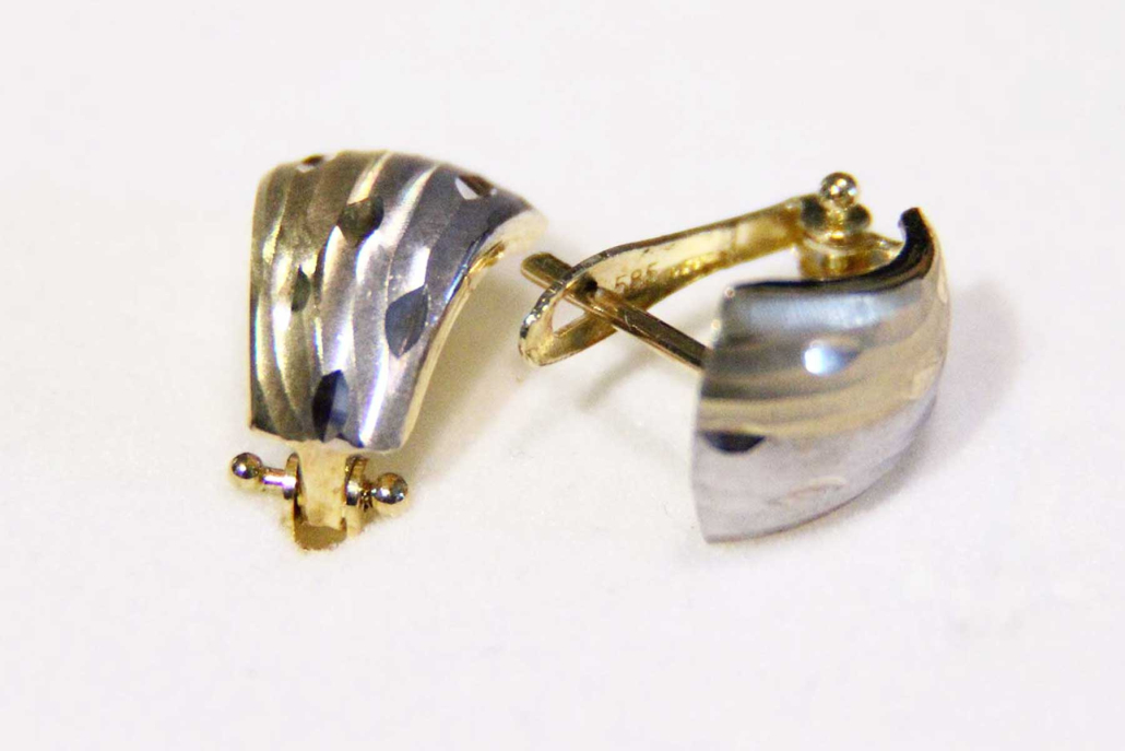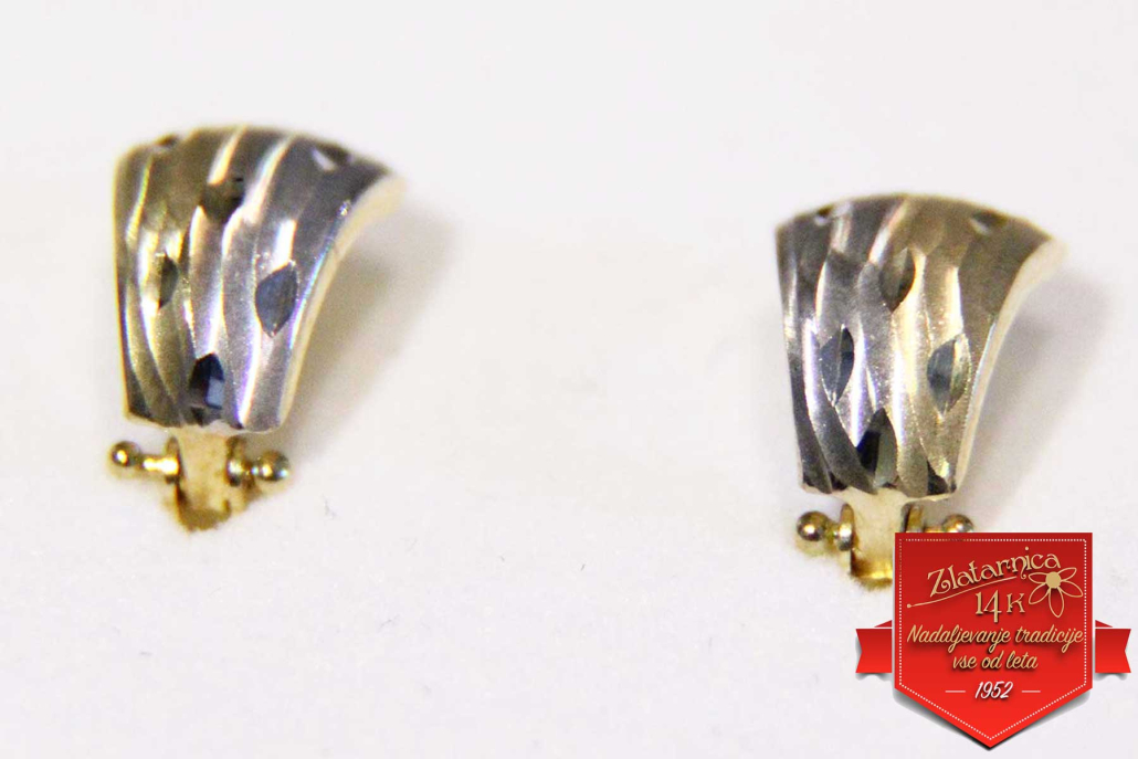 Uhani iz kombinacije rumenega in belega zlata, z vzorcem sipin in vgraviranimi vzdolžnimi črticami.
